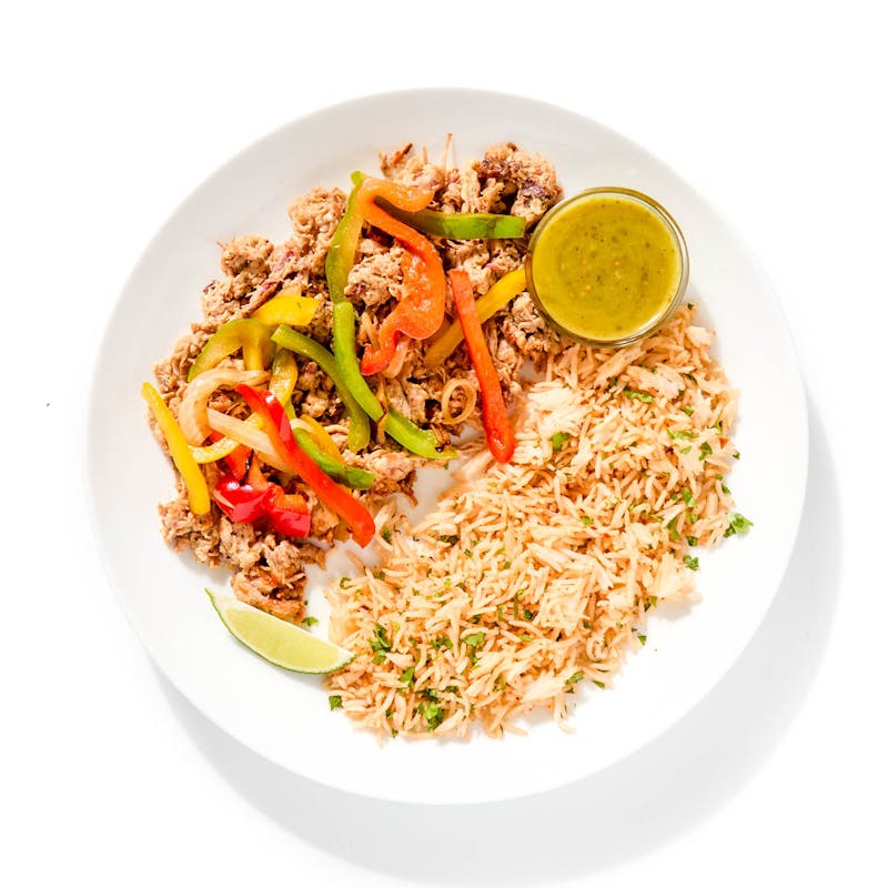 Pork shoulder is seasoned with cumin, paprika, and oregano, then braised low and slow with orange and lime juice. Juicy and caramelized, they’re served next to fluffy chipotle-infused rice, a tangle of sautéed bell peppers and onions, and a bright salsa verde made with tomatillo, serrano, cilantro, and lime.