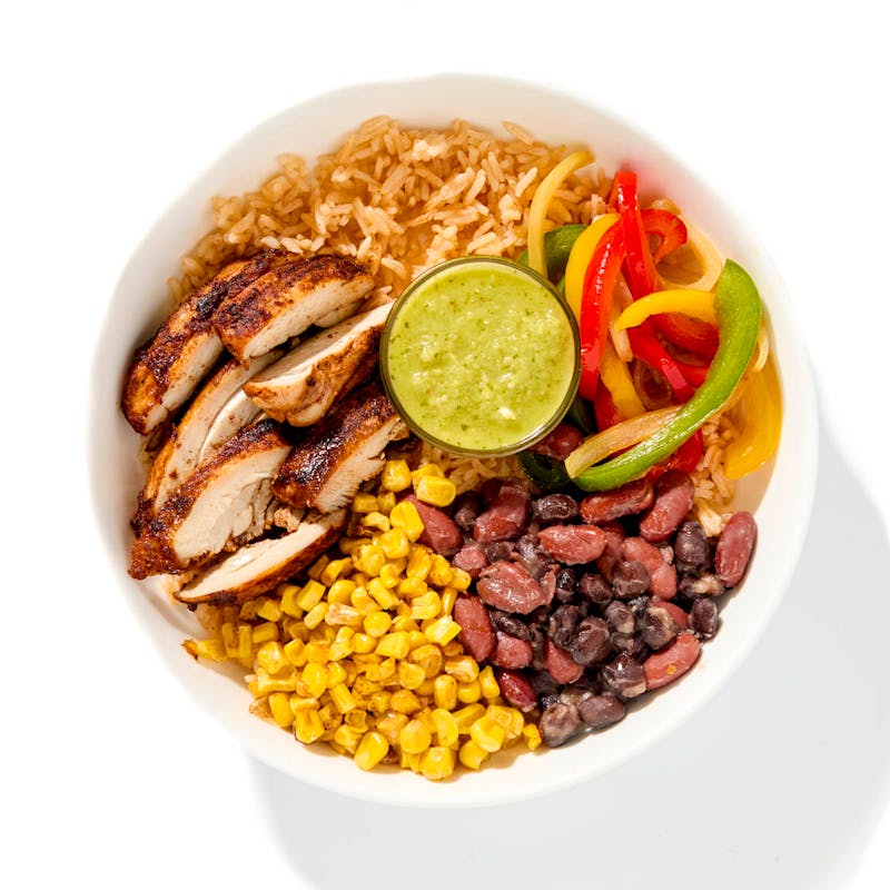 A hearty and vibrant bowl featuring chili-lime marinated chicken thighs roasted then served atop a bed of seasoned black and kidney beans, roasted sweet corn, and chipotle rice. On the side: a zesty avocado salsa to bring it home.