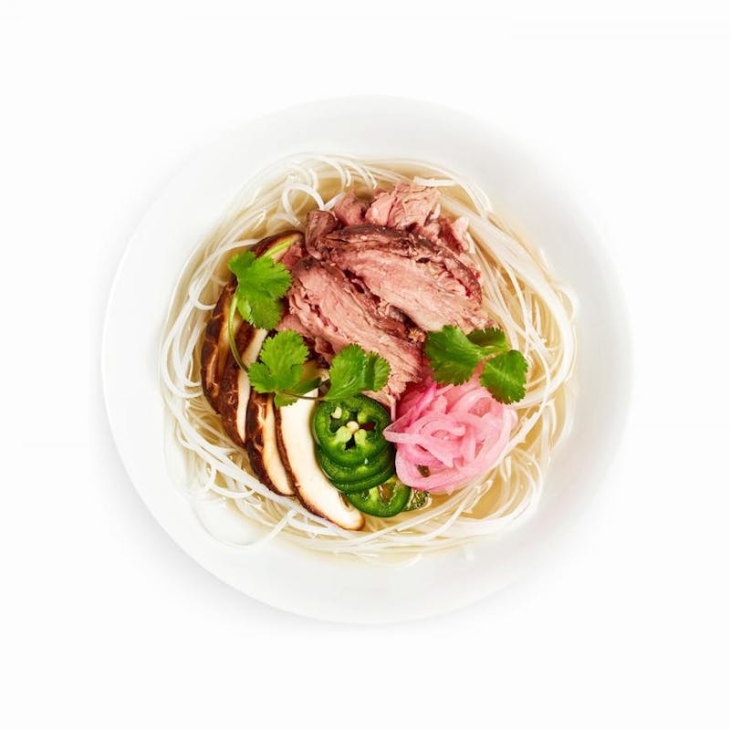 This is a classic noodle soup originating from Northern Vietnam. Mok Bar pays homage to this well-loved classic with their spicy beef broth and tender sliced flank steak. The soup also features fresh rice noodles, shiitake mushrooms, pickled red onions, sliced jalapeños, a lime wedge, and fresh cilantro for the perfect balance of umami and tang, richness and acid.