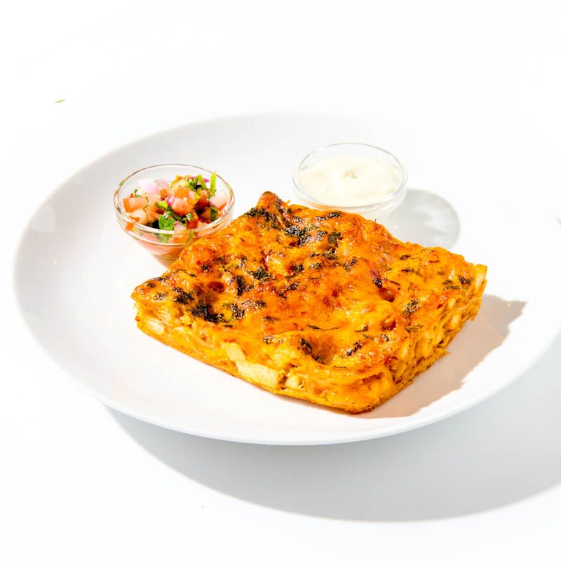 This hearty, Mexican-inspired bake layers roasted chicken, refried beans, fried corn tortillas, and a cheddar-chihuahua cheese blend, all smothered in a creamy ranchera sauce made with tomatoes, jalapeños, garlic, and Mexican crema. Finished with chopped cilantro and served with zesty pico de gallo and cool sour cream on the side, it’s a playful twist on traditional chilaquiles.