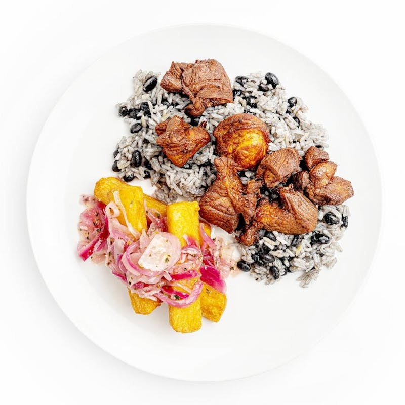 Yucca Fries, Canola and Olive Oil Blend, Canned Black Beans, Oregano, Red Onion, Cilantro, Garlic, Onion, Jasmine Rice, Kosher Salt, Lime Juice, Orange Juice, Canola Oil, Pork Shoulder
