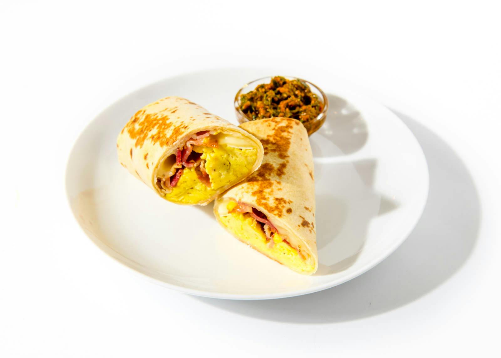 Soft scrambled eggs, brie, and crisp bacon are wrapped in a warm flour tortilla, then lightly toasted to golden brown. On the side: a vibrant sun-dried tomato and basil pesto for dipping or drizzling.