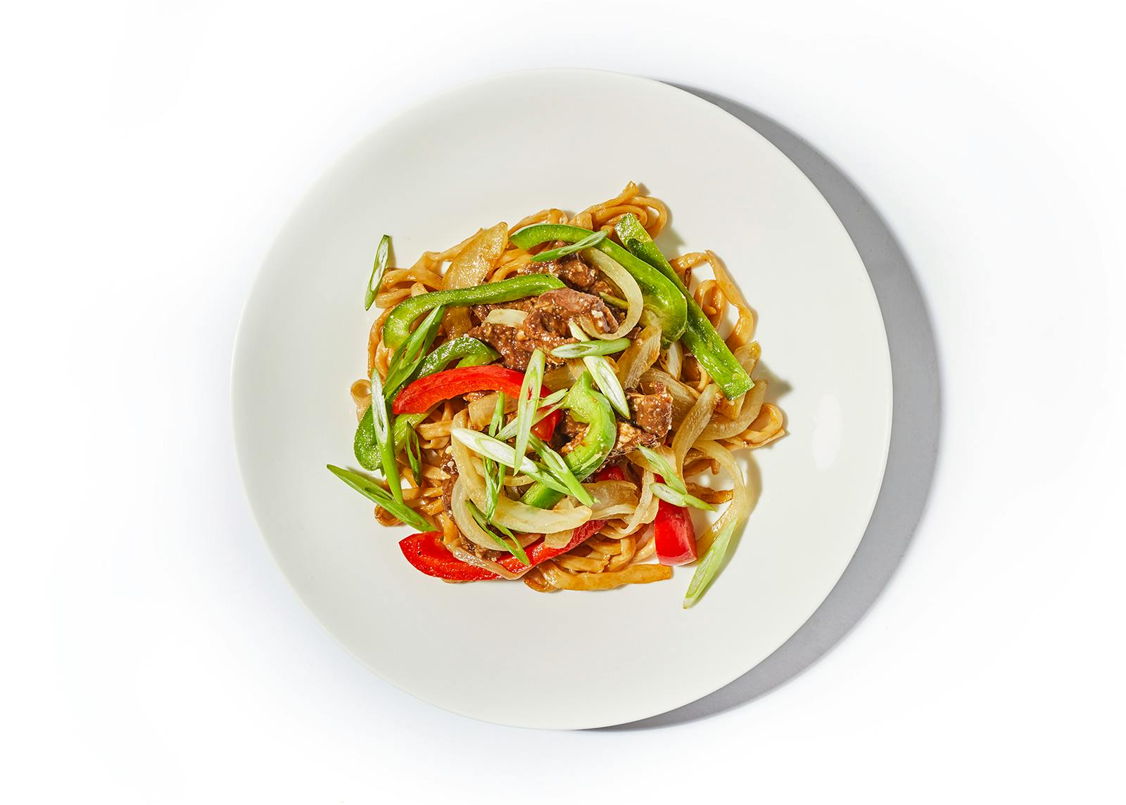 Tender black pepper flank steak and savory Chinese sausage are the perfect complement to chewy Chow Mein noodles seasoned with oyster sauce, Shaoxing wine, and sesame oil. Each element is stir-fried to perfection alongside peppers and onions, ensuring layers of flavor in every perfect bite.
