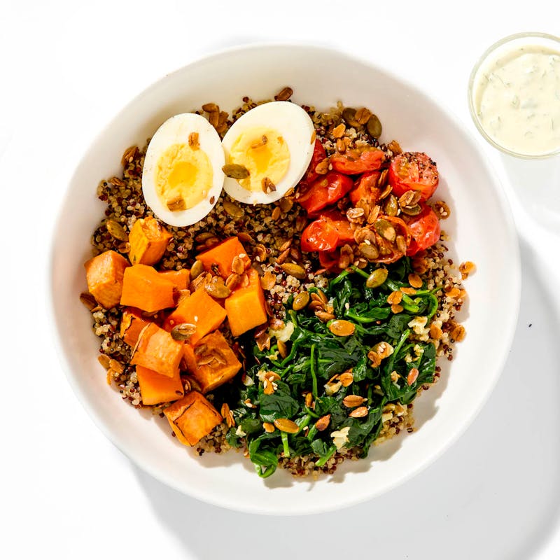 Warm quinoa sets the base for roasted sweet potatoes, garlicky sautéed spinach, and a soft-boiled egg with a just-set center. Savory seed granola on the side adds crunch, while a lemon-avocado herb yogurt brings a cool, gently tangy finish.