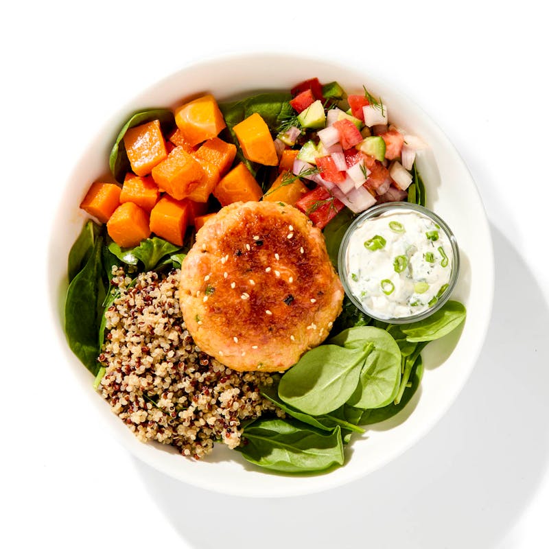 Salmon, Sweet Potatoes, Tri-color Quinoa, Plum Tomato, Greek Yogurt, Baby Spinach, Red Onion, Egg White, Cucumber, Extra Virgin Olive Oil, Lemon Juice, Panko Breadcrumbs, Chives, Dijon Mustard, Dill, Green Onion, Black Sesame Seeds, Granulated Onion, Poppy Seeds, Granulated Garlic, Lemon Zest, Black Pepper, Kosher Salt