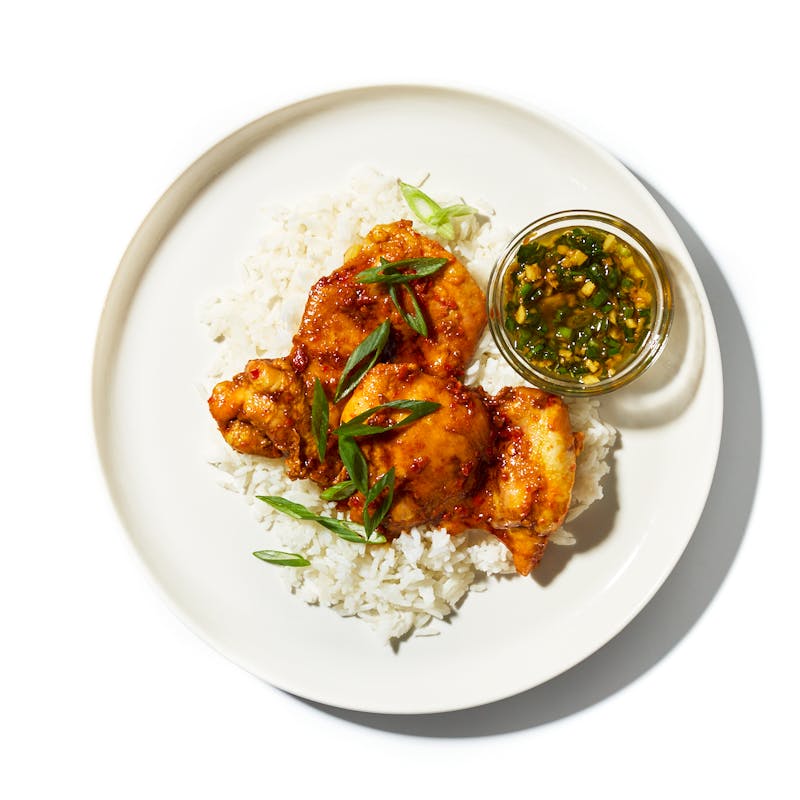 This smoky, spicy chicken harissa dish puts Middle Eastern and North African flavors in the spotlight. Chicken thighs are marinated in harissa, a flavorful Tunisian chili paste, then roasted to bring out its beautiful color and smoky, mild heat. Served with white rice sprinkled with green onions and chef Nora’s signature scallion-garlic-ginger sauce, it's sure to awaken your taste buds and spice up any night.
