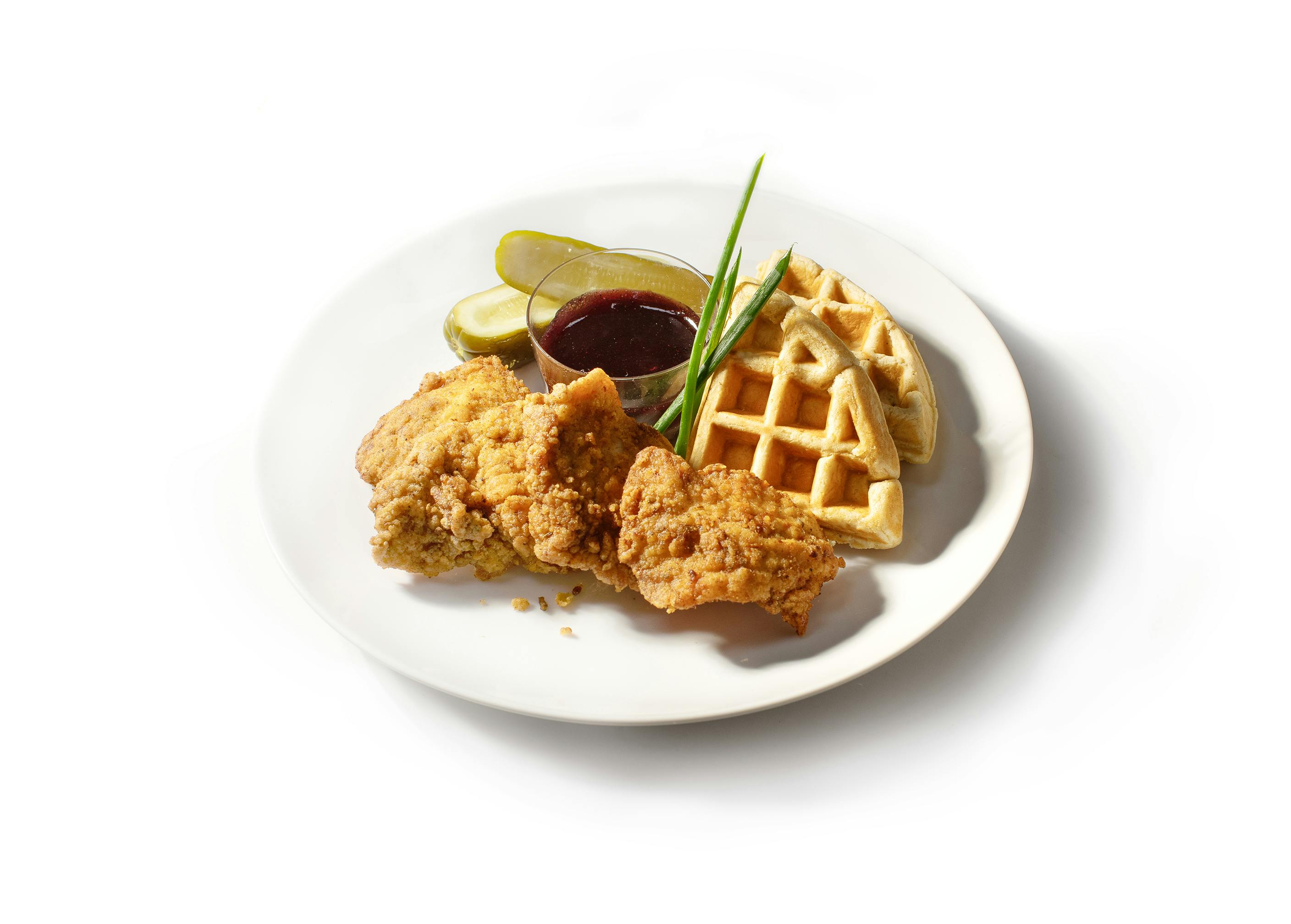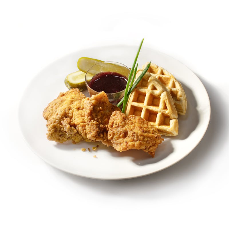 Southern classic, sweet twist. Fried chicken meets golden waffles with a side of tangy-sweet blueberry-maple glaze. A dill pickle on the side keeps things punchy.