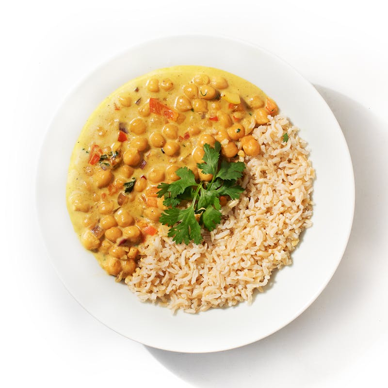This plant-based curry simmers chickpeas with sautéed onion, tomato, and garlic in a spiced coconut milk broth. Garam masala, cumin, cayenne, and Madras curry build heat and depth, while zucchini, red pepper, and smoked paprika round out the flavor. Served with steamed brown rice and a lime wedge.