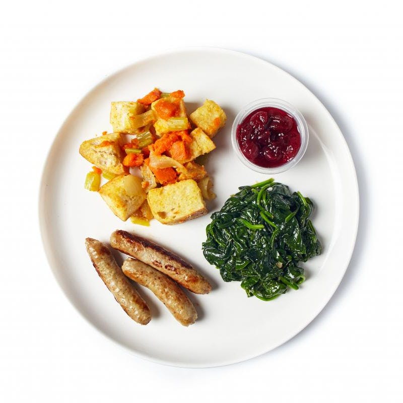 This is a holiday themed meal composed of Chef Nelson's favorite things during the holiday season! Roasted turkey sausage links are paired with Chef's favorite sides: herbed stuffing, sautéed spinach with lots of garlic, and cranberry sauce for that magical touch! Chef Nelson's stuffing is a step above the stuff from the bag, and may just ruin your for all other stuffing. Packed full of cubed country-style bread, it's infused with hardy herbs like sage and thyme, along with the typical mirepoix and garlic. Altogether these sides achieve the perfect balance of traditional Thanksgiving flavors, especially when served alongside fresh cranberry sauce that's tart and sweet with hints of cinnamon and orange.
