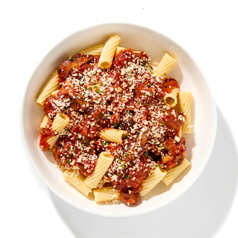 Rigatoni, Veg, Tomatoes, Whole, Canned, Italian, Crimini Mushroom, Vegan Parmesan, Shiitake Mushrooms, Extra Virgin Olive Oil, Shallot, White Wine, Onion, Balsamic Vinegar Reduction, Garlic, Kosher Salt, Tomato Paste, Sugar, Basil, Spice, Parsley, Dried, Black Pepper, Black Pepper, Harissa, Oregano, Crushed Red Pepper, Bay Leaf