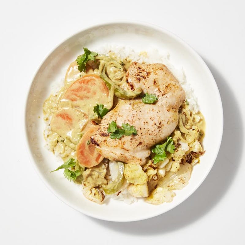 This creamy coconutty chicken curry also features onions, carrots, and green bell peppers. Sautéed napa cabbage and jasmine rice on the side complete the meal.