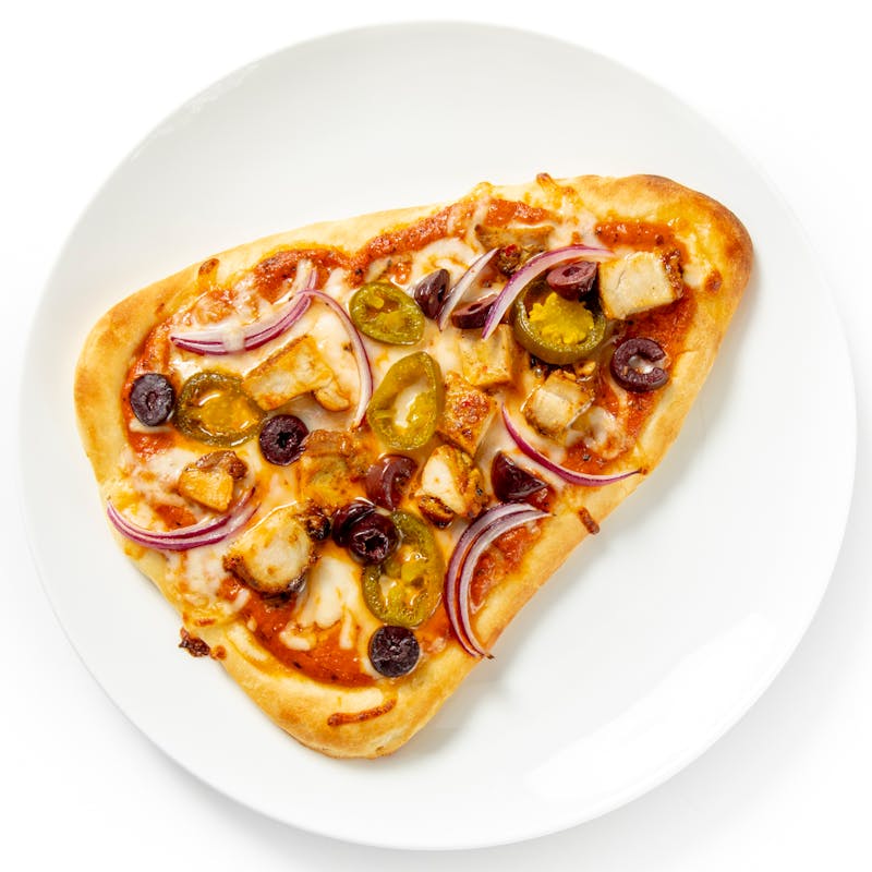 It’s pizza! It’s naan! It’s Chef Aarthi’s naanza, featuring a naan bread base topped with a blend of mozzarella and white cheddar. Diced boneless chicken thighs marinated in tikka masala are scattered over the cheesy goodness, complemented by red onions, pickled jalapeño peppers, and black olives. Chef highly recommends heating this one in the oven.