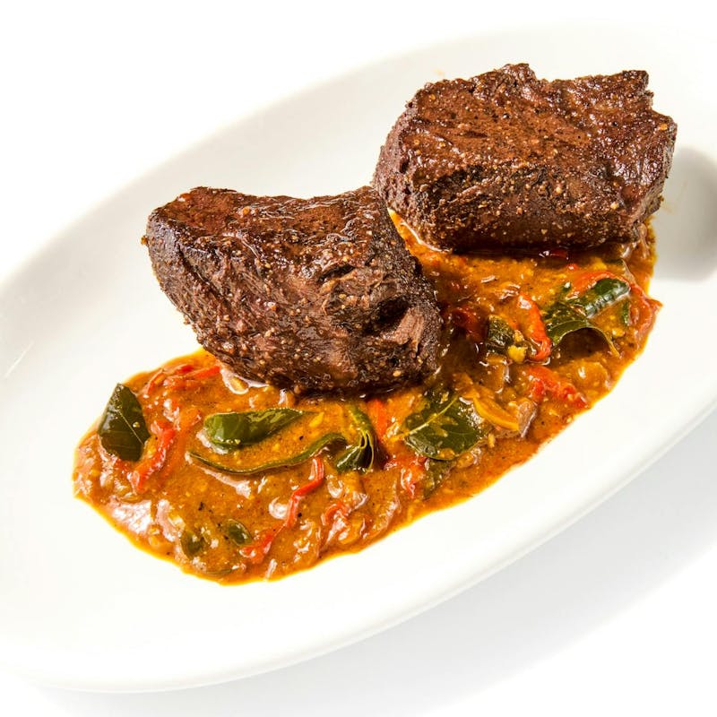 Enjoy a double portion of Chef Aarthi's inventive take on a traditional French steak au poivre. The most delicious filet mignon gets rubbed with a special spice blend then chargrilled to perfection and served an Indian-style sauce made with Kerala Tellicherry peppercorns. These peppercorns are more fragrant and sweet than the typical, giving the rich sauce a citrusy punch that makes it irresistible. Pair with a side of rice, grilled veggies, a baked potato, or whatever you're craving tonight.