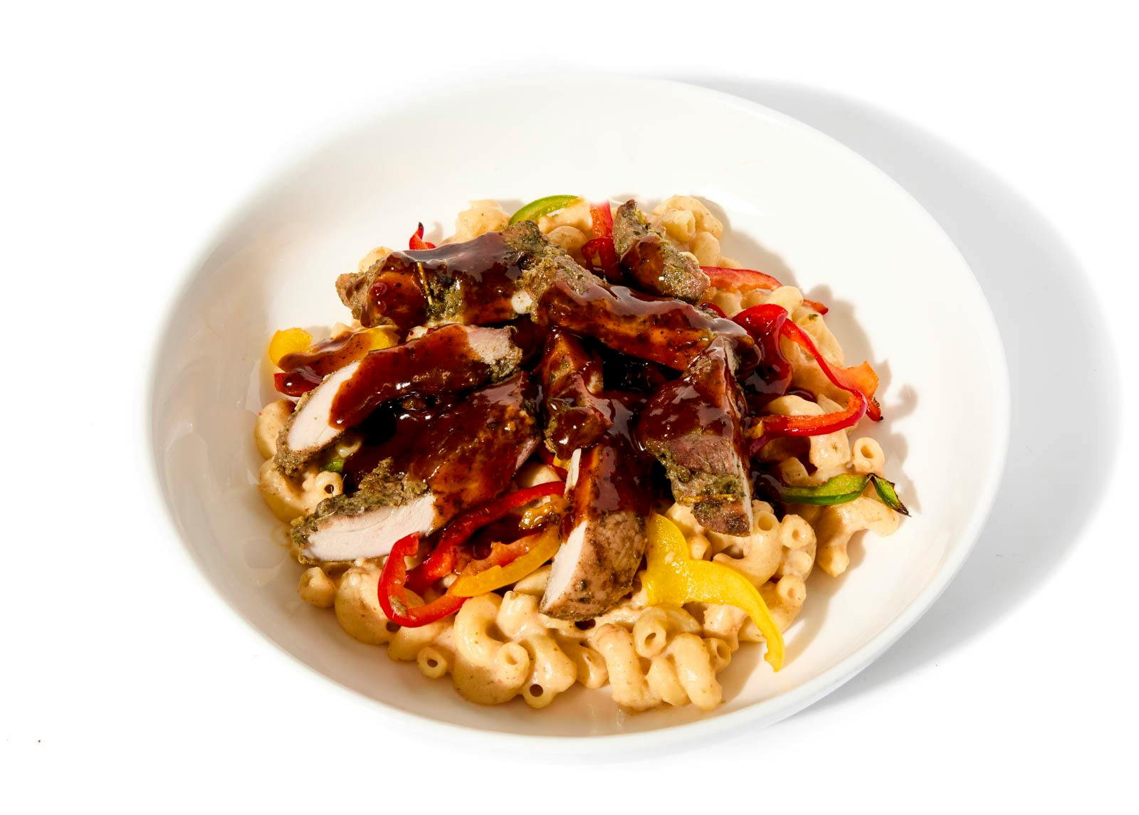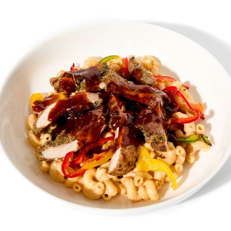 Monterrey-Jack Cheese, Sharp Cheddar Cheese, Nutmeg, Frank's Hot Sauce, Chicken Thigh, BBQ Sauce, Yellow Bell Pepper, Habanero Peppers, All Purpose Flour, Butter, Red Onion, Allspice, Avocado Oil, Garlic, Mozzarella Cheese, Sugar, Kosher Salt, Espelette Pepper , Gluten Free Tamari, Lime Juice, Thyme, Green Bell Pepper, Red Bell Pepper, Whole Milk, Italian Parsley, Elbow Pasta