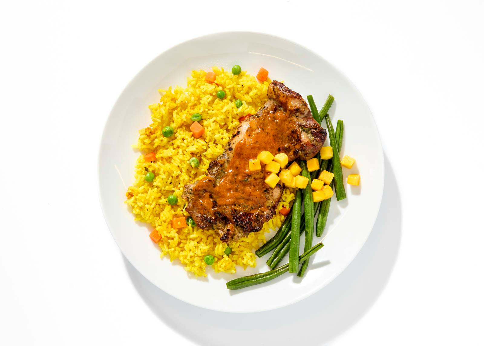 Chef Aarthi makes this dish for herself all the time. Packed with veggies and protein, the plate stars jerk-marinated chicken roasted with thyme, allspice, and habanero heat, then finished with a sweet mango jerk sauce and mango slices on top. Served with Caribbean yellow rice and sautéed greens.