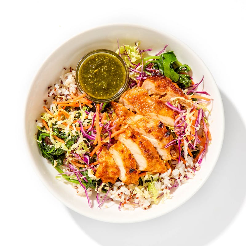 Mighty flavorful and mighty nutritious, too! Tender grilled chicken mingles with tender sautéed baby spinach and kale and a nutrient-packed blend of grains, including fonio, millet, quinoa, and Basmati rice—all drizzled with super-savory pumpkin seed and Castelvetrano olive pesto. This vibrant dish offers a deliciously healthy twist that’s perfect for lunch or dinner. Dive into wholesome flavors and feel great with every bite!