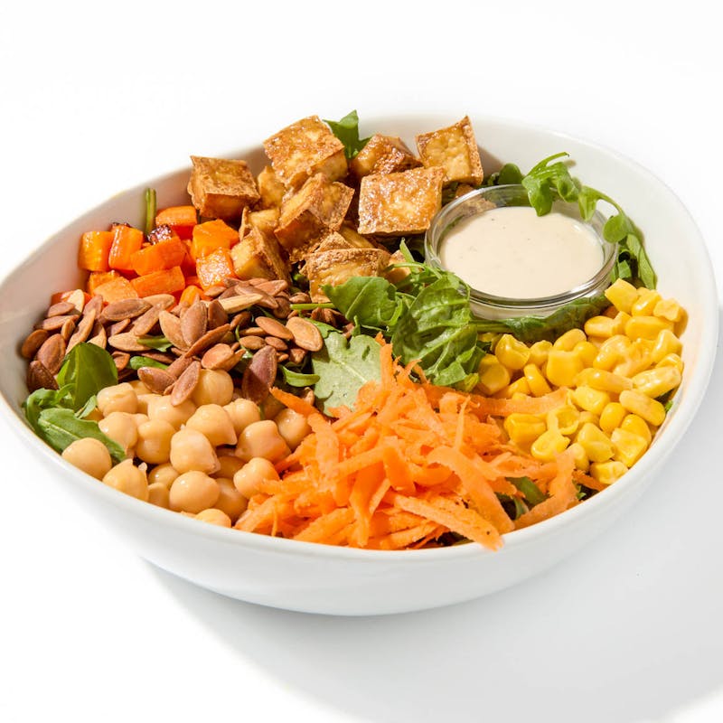 Whether you're plant-based or just looking to eat a healthy, balanced diet, Chef Cami's Protein Tofu Salad is a no-brainer. Brimming with wholesome ingredients, this vibrant bowl features perfectly baked tofu cubes, golden and crispy on the outside, and nestled on a bed of crisp spring mix. Sweet corn, hearty garbanzo beans, baked sweet potato, and crunchy shredded carrots all add delightful texture and flavor. Topped with a sprinkle of nutty pumpkin seeds and drizzled with a creamy vegan ranch dressing, this salad is as nourishing as it is delicious.