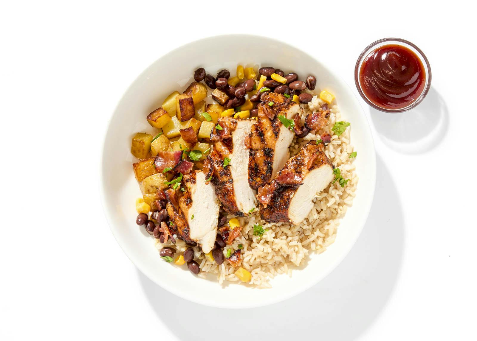 Here's a fresh grain and greens salad to keep you satisfied and energized throughout the day. This bowl of goodness starts with a bed of arugula and nutty farro, then Chef Dustin adds in oven-roasted red beets and Brussels sprouts and roasted chicken. Topped with crumbled feta, walnuts, and fresh herbs like mint, chives, and parsley, this salad is sure to brighten your day!