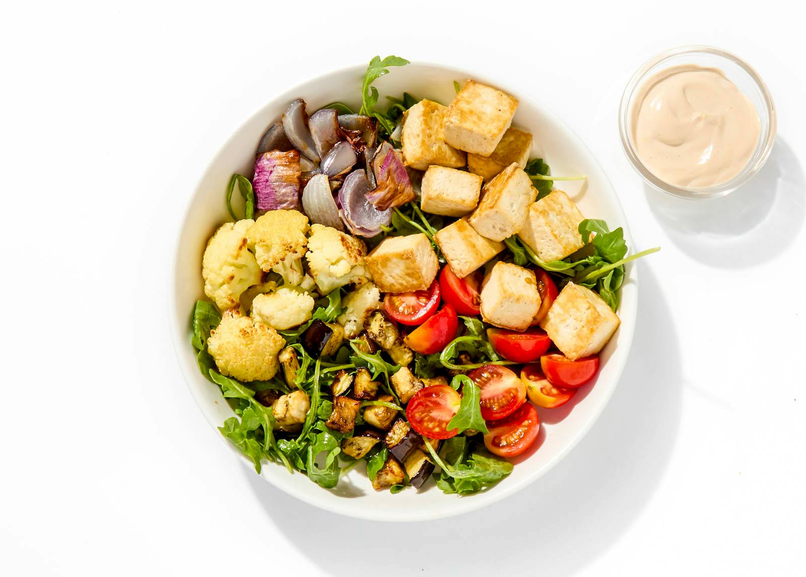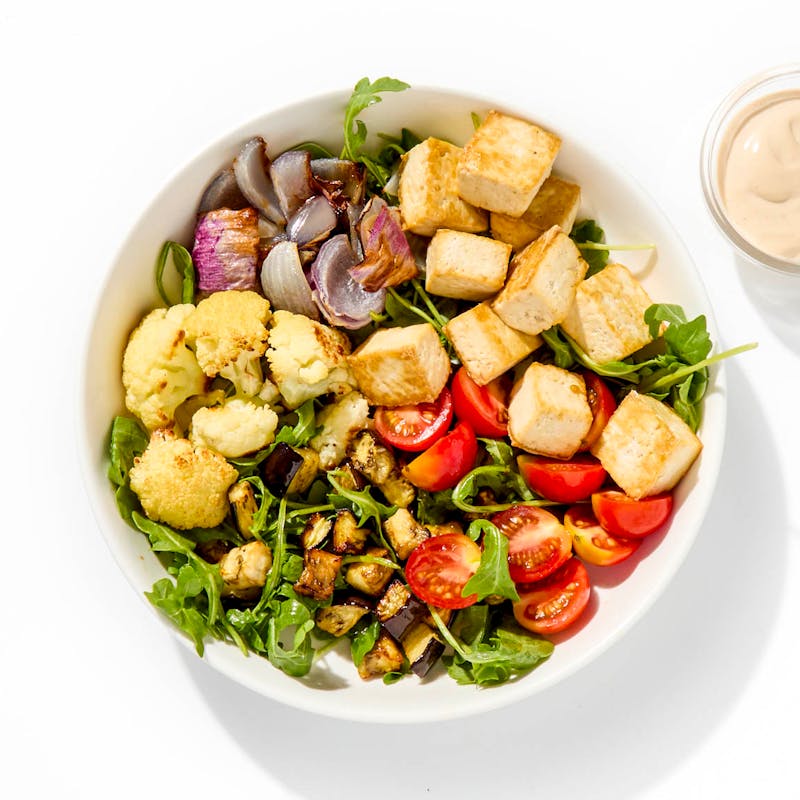 Organic Tofu, Cherry Tomato, Eggplant, Organic Cauliflower, Coconut Yogurt, Arugula, Red Onion, Extra Virgin Olive Oil, Lime Juice, Miso Paste, Organic Garlic, Black Pepper, Kosher Salt