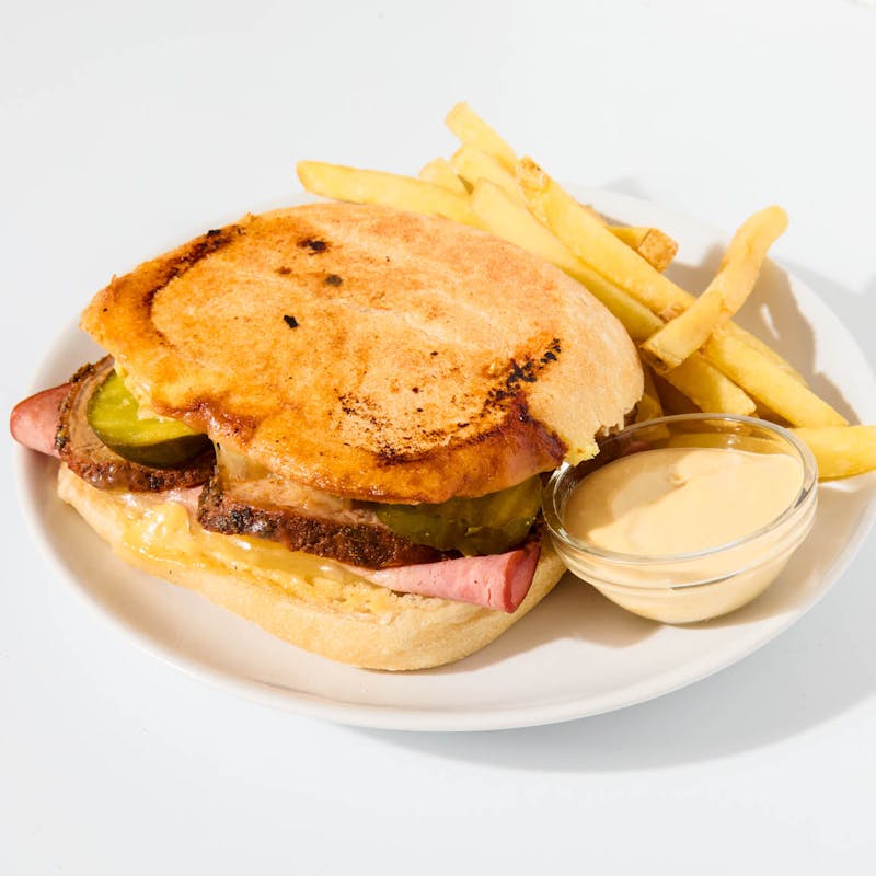 Meet your new favorite sandwich: a flavor-packed Cubano stacked with juicy mojo-marinated pork loin, smoky ham, melty Swiss cheese, tangy pickles, and a generous swipe of housemade dijonnaise—all pressed between buttery ciabatta until golden and crisp. The rich, savory filling is balanced by the crunch of the toasted roll—and yes, it comes with a side of paprika-dusted fries for good measure.