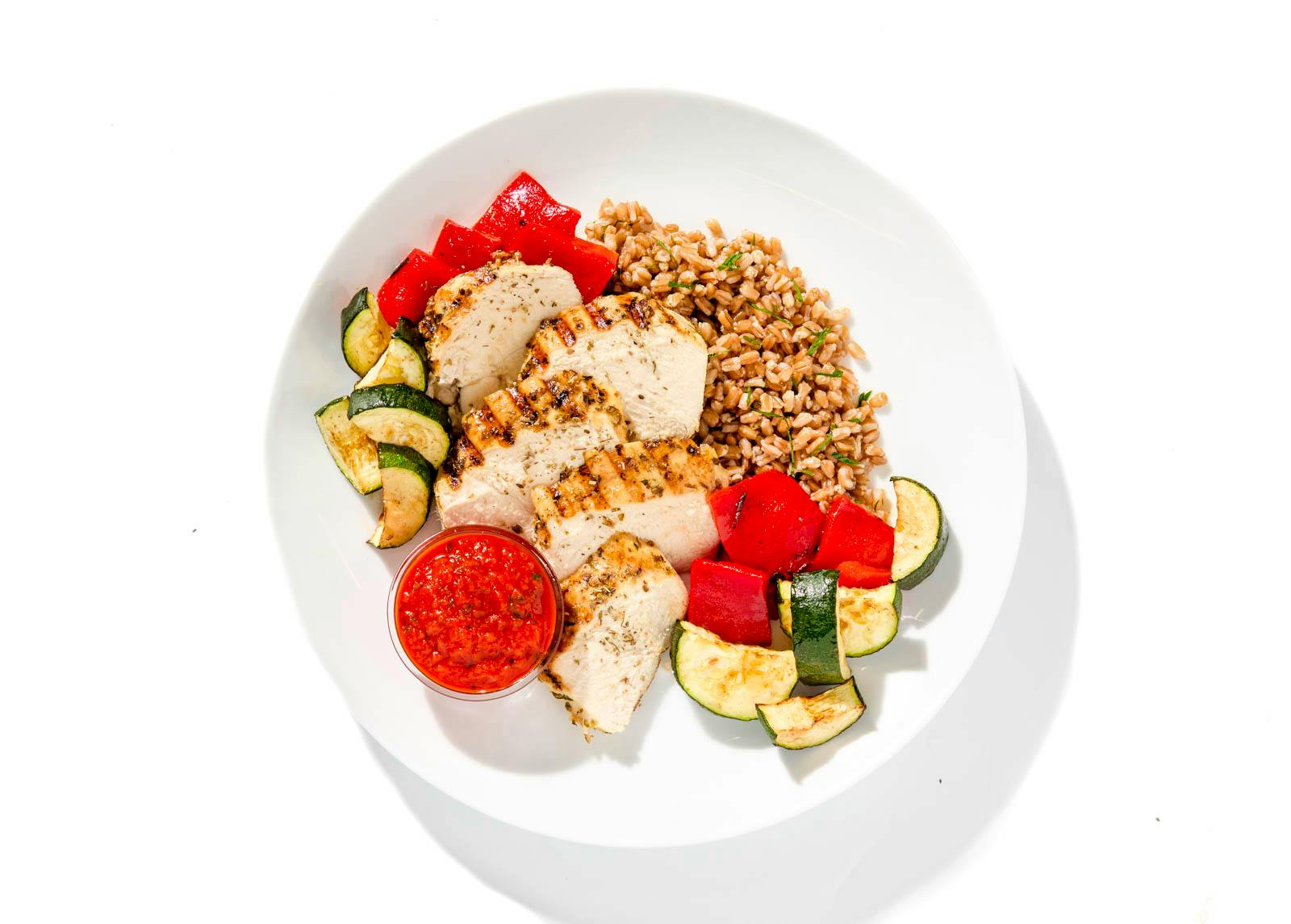 Grilled chicken meets the bright, smoky heat of Moroccan-style shakshuka in this layered Mediterranean plate. It’s grounded with nutty herbed farro, roasted zucchini, and sweet bell peppers—all finished with a whisper of parsley to freshen every bite.