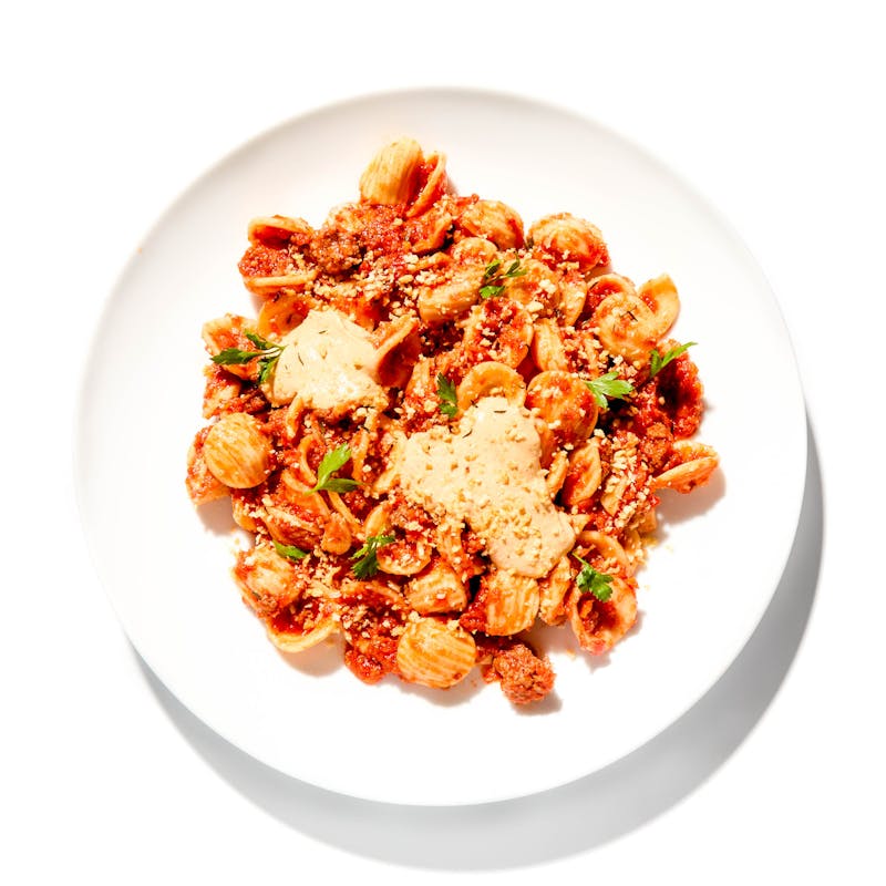 What happens when Chef Einat brings an Italian classic to the Middle East? This delicious dish! Beef is braised with Tunisian harissa for a tangy, slightly spicy twist on traditional Italian ragu. The remarkably flavorful sauce is tossed with orecchiette pasta and topped with crispy garlic-and-herb breadcrumbs as well as a dollop of smoky & spicy harissa crema for a symphony of flavors and textures.