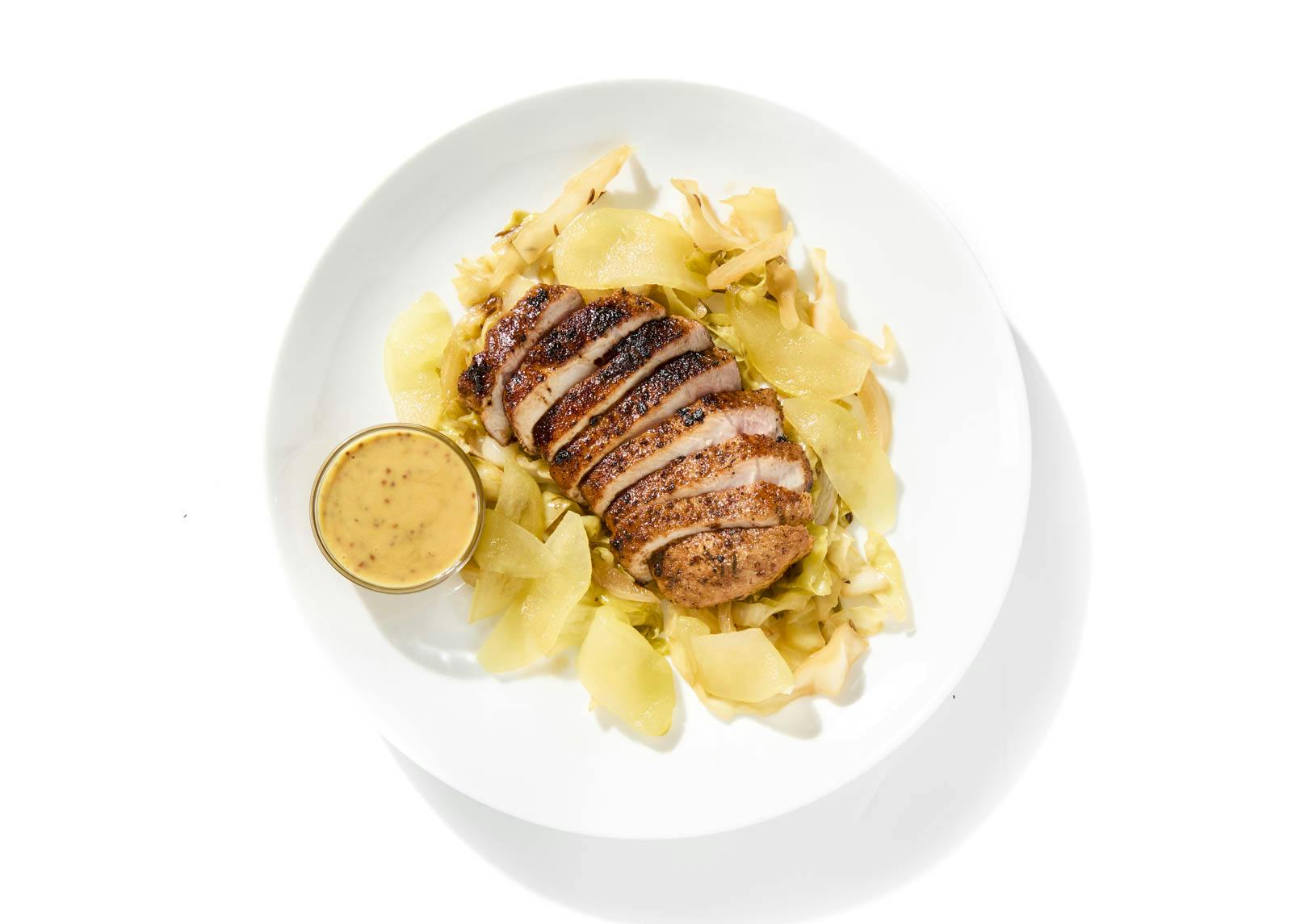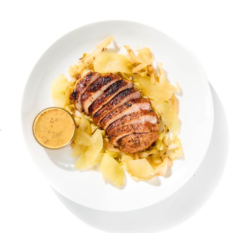 Pork Tenderloin, Cabbage, Granny Smith Apple, Onion, Honey, Whole Grain Mustard, Cider Vinegar, Sugar, Butter, Kosher Salt, Canola Oil, Apple Cider Vinegar, Dijon Mustard, Chicken Base, Caraway Seed, Black Pepper, Fennel Seed