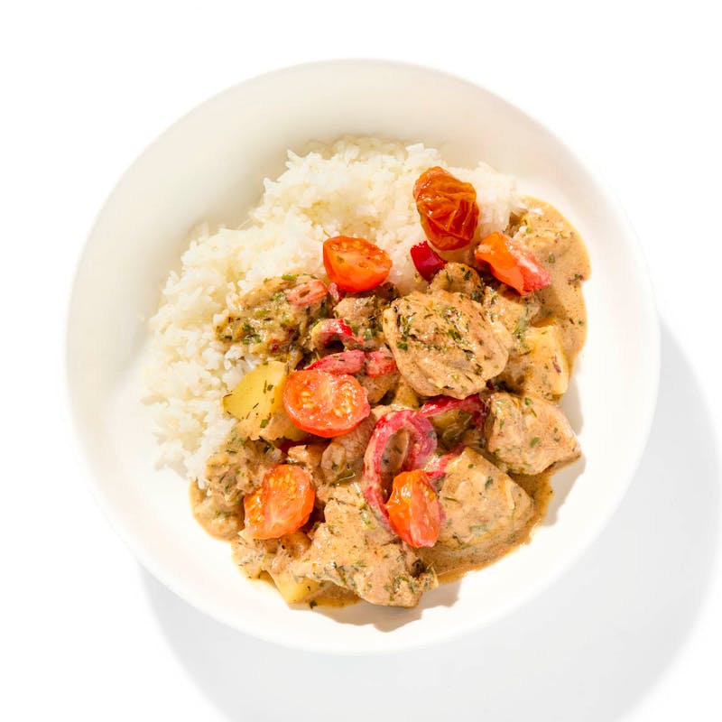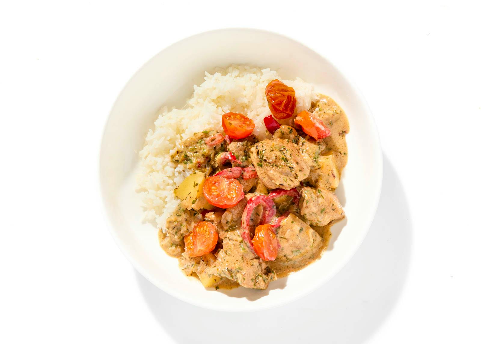 This Caribbean-inspired chicken stew gets its depth from a bold marinade of habanero, garlic, allspice, and thyme. Braised with coconut milk, Yukon potatoes, and aromatics, the result is rich and warming without being heavy. Served with steamed rice and roasted cherry tomatoes to balance the heat.