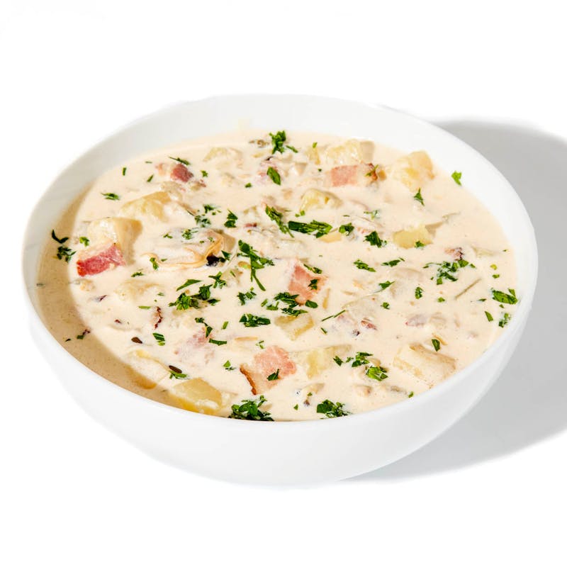 Chopped ocean clams and buttery Yukon potatoes swim in a silky broth laced with leeks, fresh herbs, and crisped bacon. A splash of hot sauce at the end lifts it just enough to keep you going back in.
