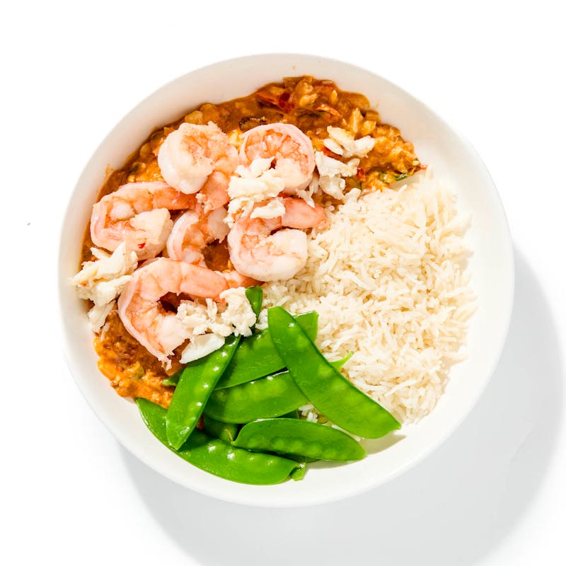 Coconut Milk, Shrimp, Jasmine Rice, Crab, Red Bell Pepper, Sugar Snap Peas, Snow Peas, Red Onion, Canola and Olive Oil Blend, Celery, Red Curry Paste, Green Onion, Chicken Base, Lemongrass, Fish Sauce, Butter, Sugar, Ginger, Lime, Kosher Salt, Star Anise