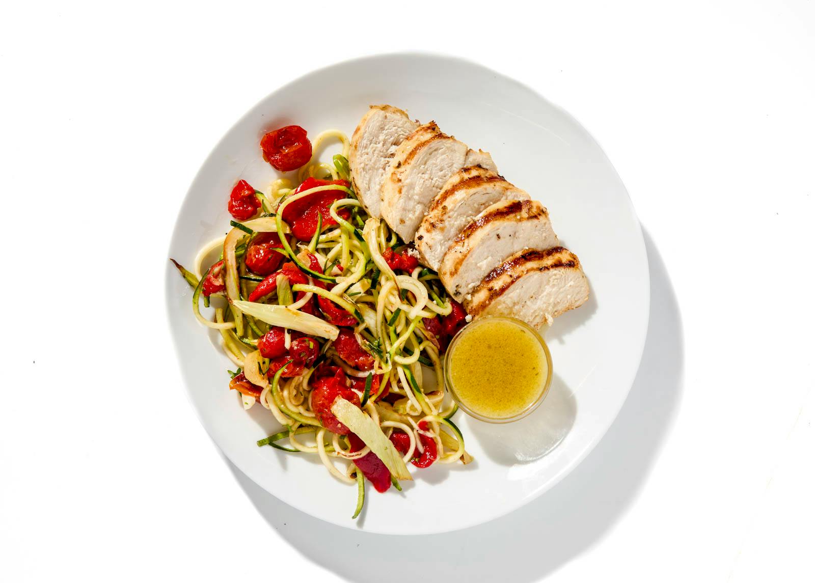 Chef Michelle loves to marinate with Italian vinaigrette, which tenderizes the grilled chicken while tying together zucchini noodles, roasted peppers, fennel, and tomatoes. Extra vinaigrette is served on the side.