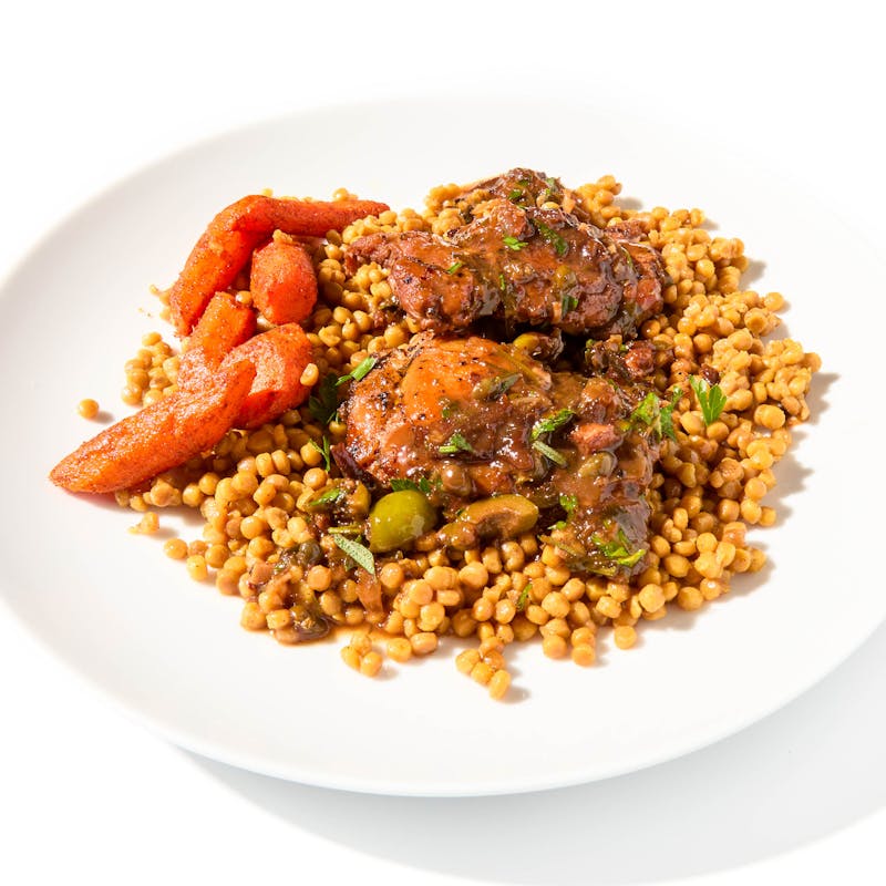 Chicken Thigh, Israeli Couscous, Carrots, Red Wine, Castelvetrano Olives, Prunes, Extra Virgin Olive Oil, Butter, Garlic, Red Wine Vinegar, Sugar, Chicken Base, Capers, Light Brown Sugar, Kosher Salt, Canola and Olive Oil Blend, All Purpose Flour, Coriander, Shallot, Italian Parsley, Rosemary, Oregano, Black Pepper, Cinnamon, Aleppo Pepper, Thyme, Bay Leaf