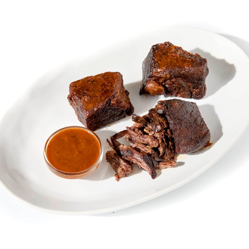 The beef short ribs are cured to bring out the most flavor, then slowly braised with vegetables, red wine, and beef broth. When fork tender, they're served with their cooking liquid and a puree made from poached cauliflower and a little brown butter.