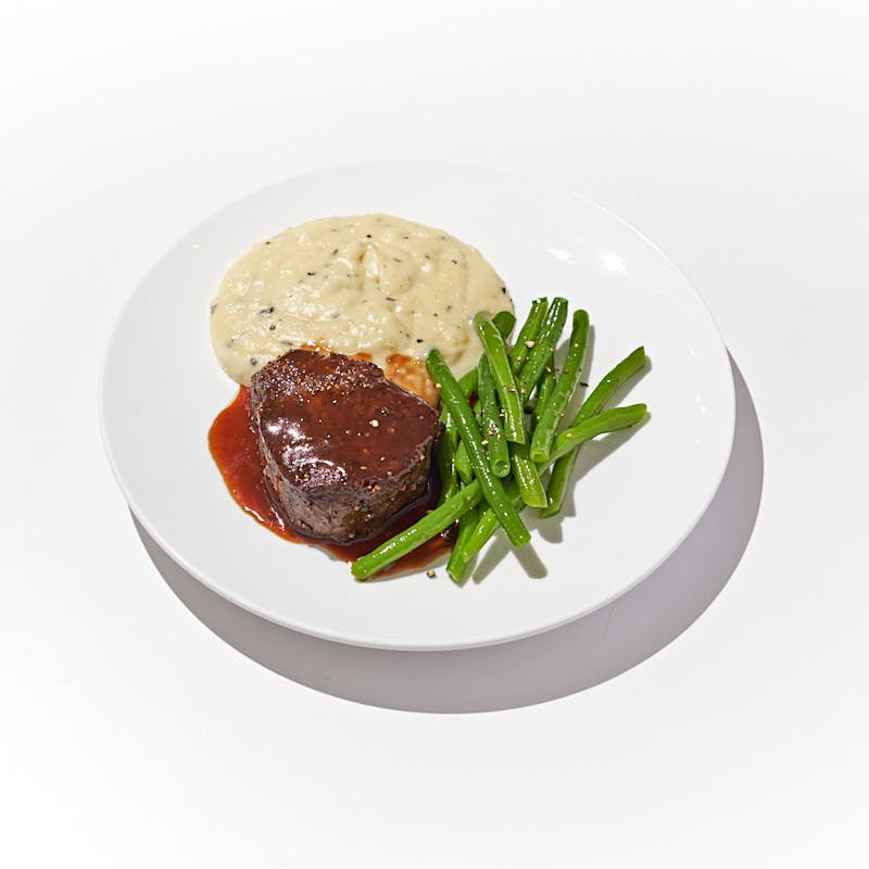 Tenderloin Steak, Yukon Potatoes, Green Beans, Red Wine, Butter, Whole Milk, Heavy Cream, Veal Demi-Glace Base, Garlic, Canola and Olive Oil Blend, Shallot, Sugar, Onion, Carrots, Kosher Salt, Truffle Oil, Truffle Seasoning, Thyme, Black Pepper, Rosemary, Bay Leaf