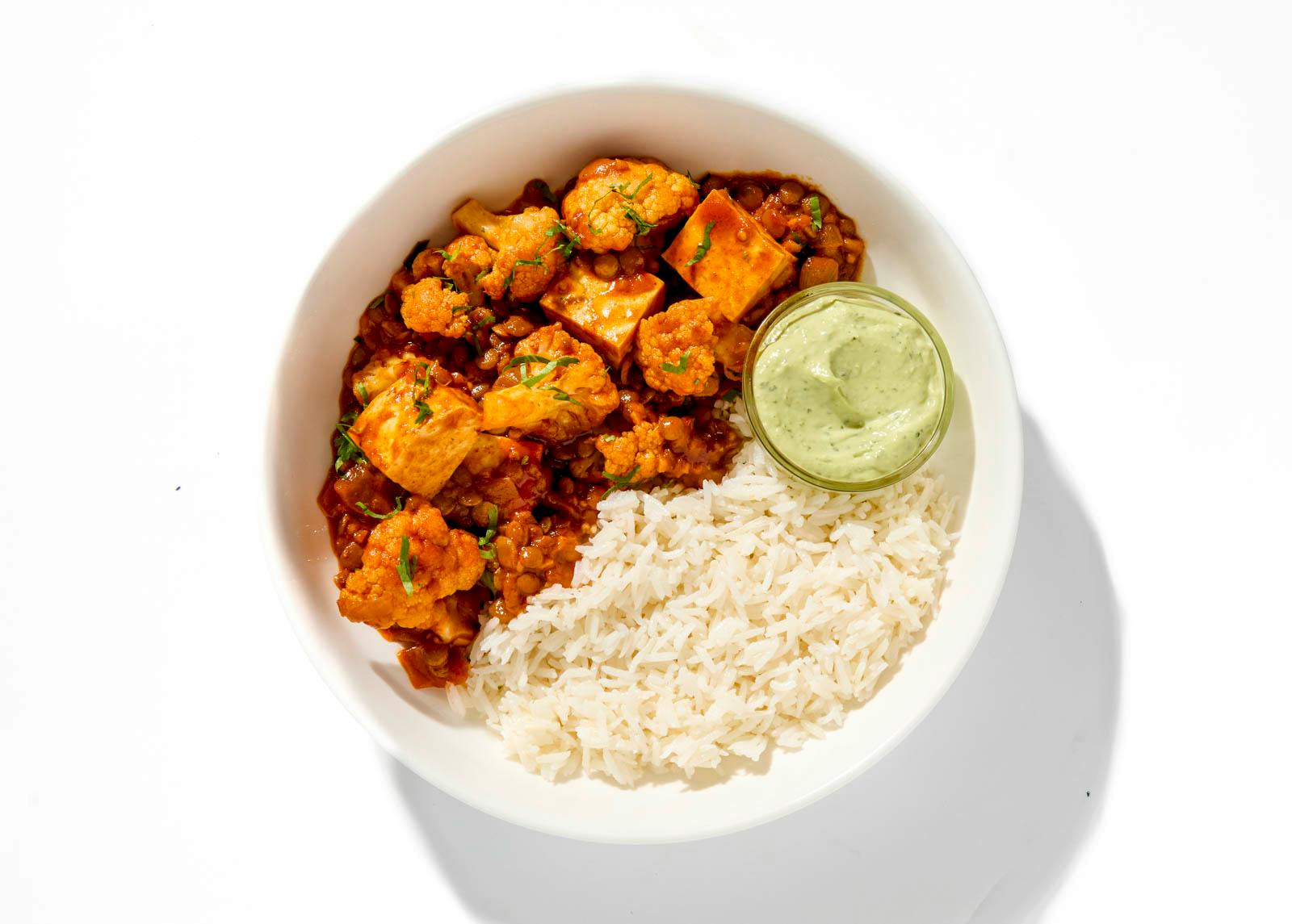 This plant-powered curry leans into the slow burn. Tofu and cauliflower soak up a tangy and savory rich vindaloo sauce spiced with ginger, curry leaves, and mustard seed, topped with fresh cilantro. Served alongside coconut milk basmati rice and an herbed coconut yogurt raita, made to cool and contrast.