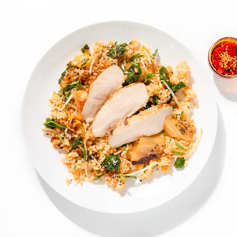 This dish is a full-on flavor bomb, rooted in Korean culinary traditions and made for spoon-straight-from-the-bowl comfort. Kimchi brings tang to wok-fried rice, tossed with wilted spinach and mung bean sprouts in a savory teriyaki sauce. It’s crowned with Korean BBQ chicken, marinated in a soy, garlic, and sesame glaze, then seared until sweet and caramelized. A side of garlic chili oil lets you dial up the heat as you please.