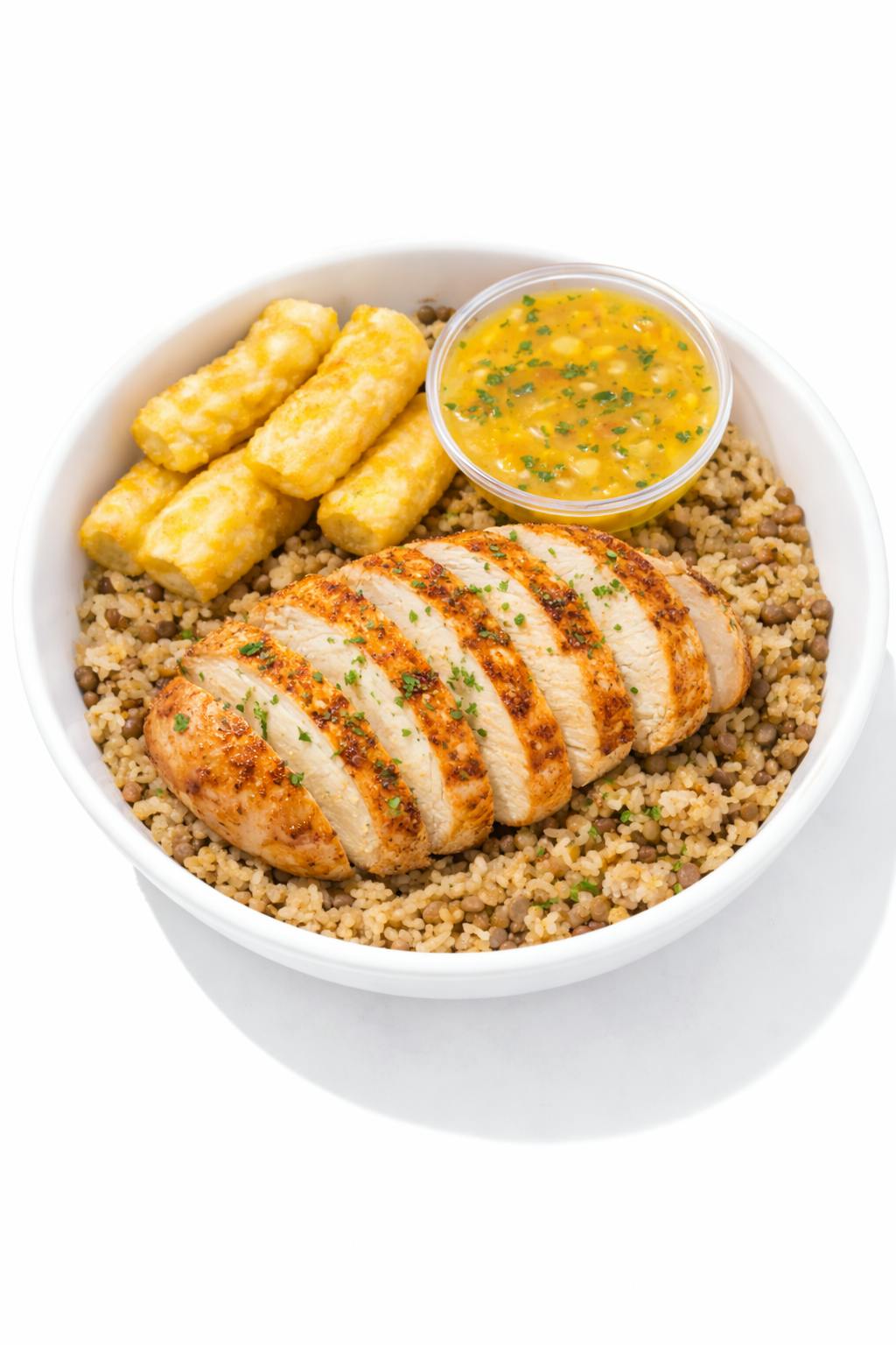 This comforting Cuban-inspired dish features tender roasted chicken breast served with a savory tomato and bell pepper sauce, layered with briny capers and green olives for depth. Served alongside fluffy jasmine rice with peas, this dish delivers a warm, hearty, and satisfying experience without feeling heavy.