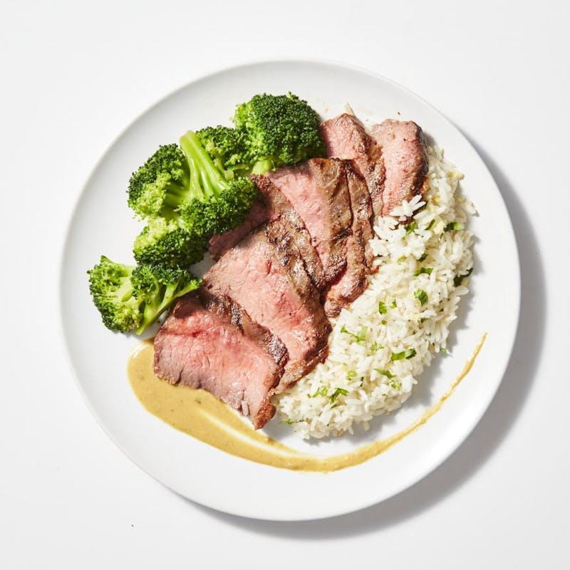 Flank Steak, Canola and Olive Oil Blend, Red Curry Paste, Oregano, Broccoli , Black Pepper, Cumin, Cilantro, Garlic, Achiote Paste, Coconut Flakes, Jasmine Rice, Kosher Salt, Jalapeno Peppers, Shallot, Guajillo Chile, Chicken Base, Coconut Milk, Apple Cider Vinegar, Lime Juice, Orange Juice, Ginger, Lemongrass