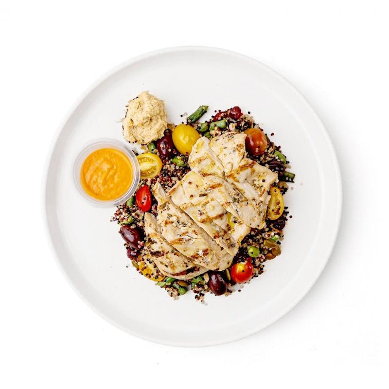 This bowl from chef Ruben brings a bright taste of the Greek isles to your table. Juicy chicken breast is served over a hearty bed of quinoa and creamy hummus and topped with cherry tomatoes and Kalamata olives, along with a smoky tomato vinaigrette. Fresh yet filling, this bowl will fuel you all day long, the Mediterranean way!