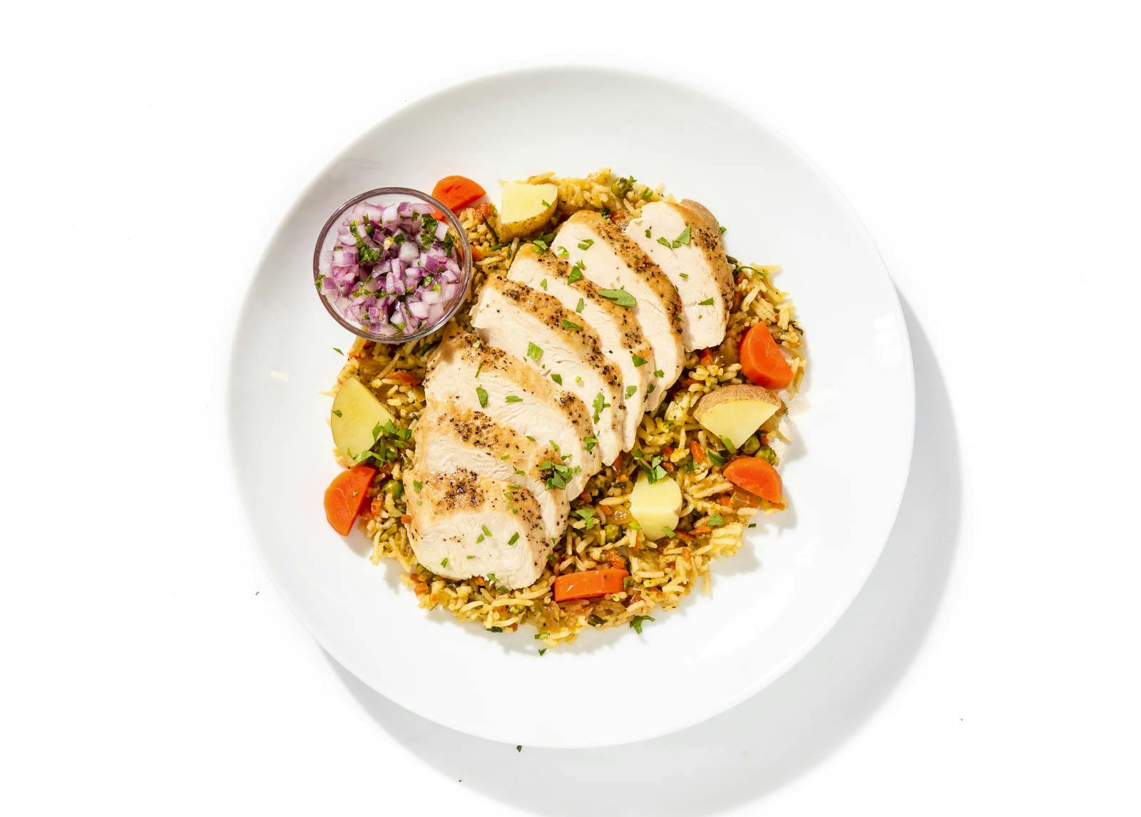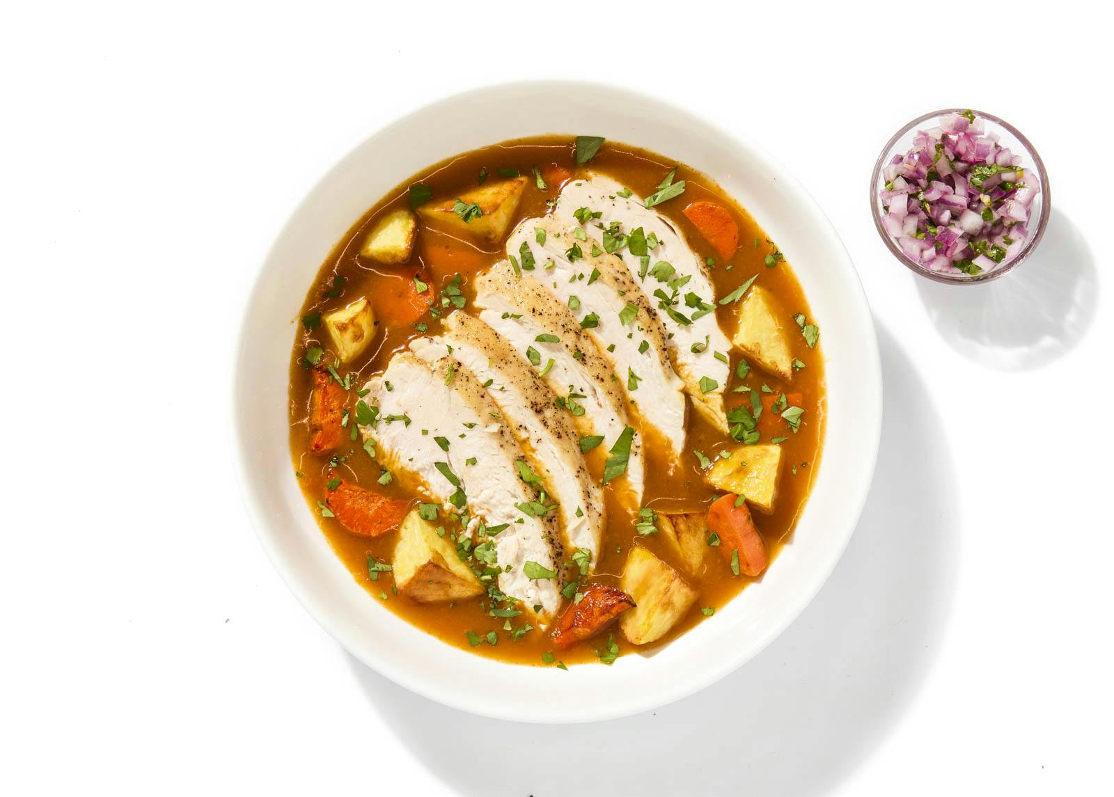 Bright and tropical, this dish stars roasted chicken breast with carrots, onions, and potatoes, all finished in a tangy-sweet passionfruit glaze. Soy, agave, and citrus deepen the flavor, while a cilantro-onion relish keeps things sharp.