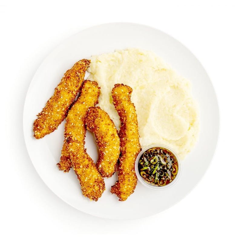 A nostalgic childhood favorite, all grown up. Crispy chicken tenders get a boost of flavor from a savory panko breadcrumb coating flecked with sesame seeds and parmesan cheese. Fried to golden brown perfection, then served with a zesty ginger-garlic soy dipping sauce, the chicken tenders are accompanied by a cauliflower mash that's creamy and rich, but a little lighter than the usual potatoes. This dish has all the same comforting flavors and textures from your childhood, just kicked up a notch.