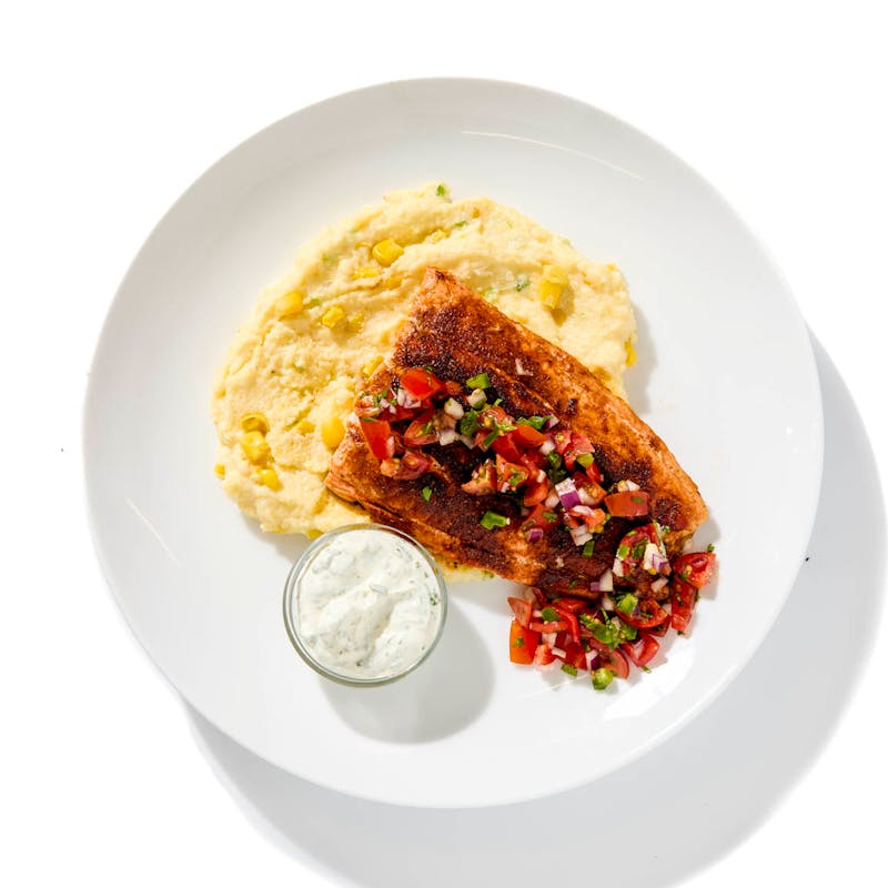 Chef Cindy’s coastal-inspired dish pairs seared, oven-finished salmon with creamy polenta folded with sweet corn and parmesan. Chef rounds out the plate with zesty pico de gallo and an herbaceous cilantro crema.