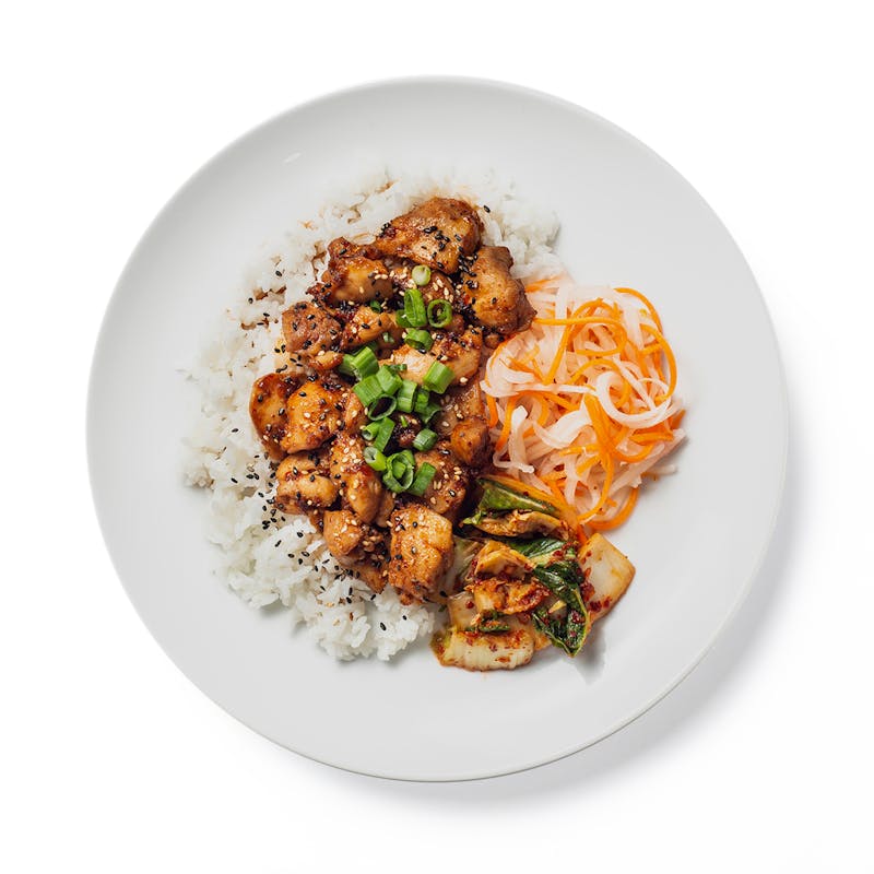 Bring the heat on any weeknight with this spicy, flavor-packed, one-bowl meal. Tender, juicy pieces of diced chicken thigh get marinated in sweet and savory Korean teriyaki sauce, kicked up with extra chili heat, then wok-fired for flavorful caramelization. It’s paired with fiery, funky kimchi—the signature Korean dish of napa cabbage, green onion, and garlic fermented with gochugaru (Korean red chili); a refreshingly crisp, sweet-and-sour daikon radish salad for crunch; and sticky rice. Stir it all together and dig in!