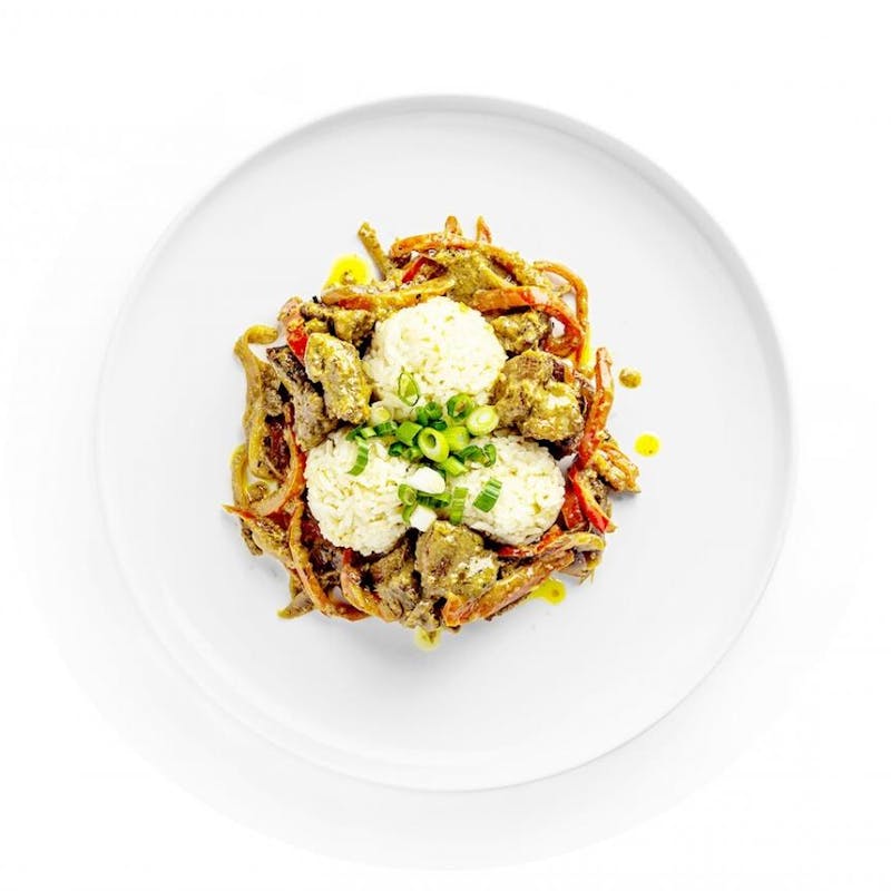 Spice Blend, Spice Blend, Red Onion, Coconut Oil, Vegetable Base, Kaffir Lime, Gum, Xanthan, Jasmine Rice, Chicken Base, Coconut Milk, Green Onion, Red Bell Pepper, Lemongrass, Lamb