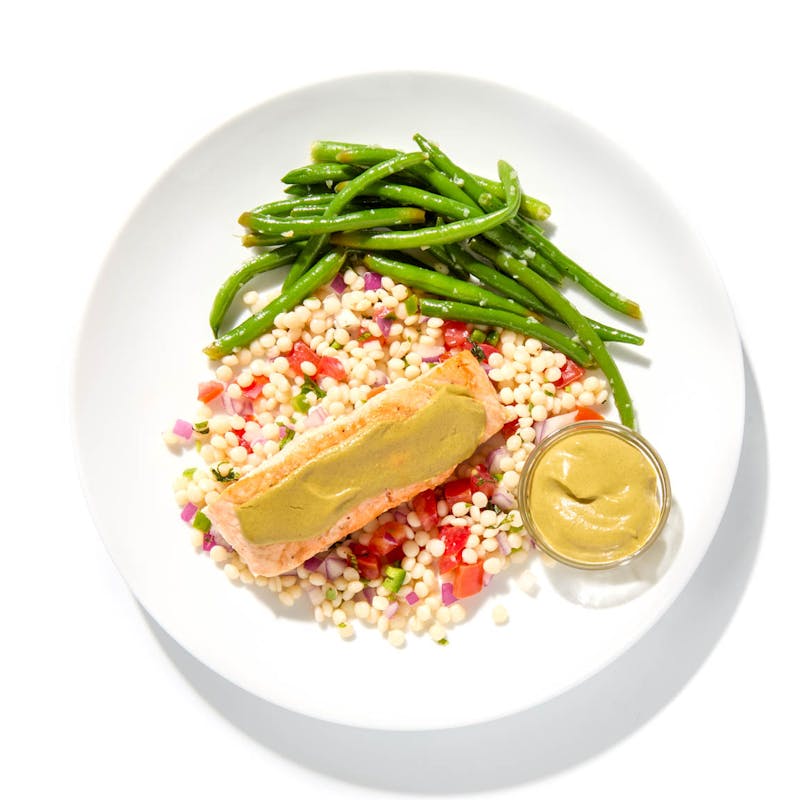 Canola and Olive Oil Blend, Pistachios, Red Onion, Plum Tomato, Serrano Peppers, Black Pepper, Cumin, Cilantro, Garlic, Cinnamon, Kosher Salt, Clove, Green Beans, Israeli Couscous, Jalapeno Peppers, Chicken Base, Lime Juice, Tomatillo, Salmon