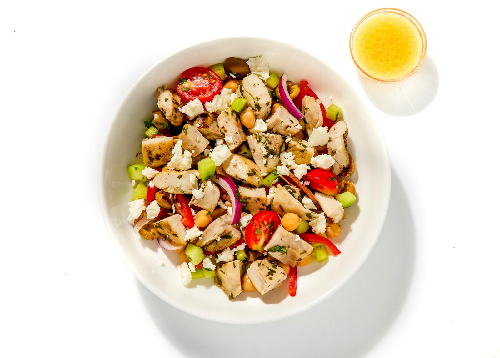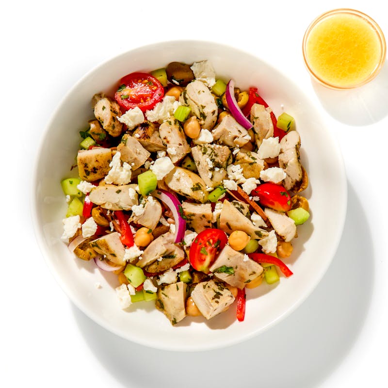 Chicken thighs are marinated in an Indonesian-style spice blend packed with coriander, garlic, and turmeric. Baked until juicy and bronzed, they’re paired with a rejuvenating chickpea salad loaded with colorful vegetables like cucumbers, cherry tomatoes, bell peppers, and mushrooms. Studded with briny green olives and crumbled feta cheese, it’s finished with a tangy lemon-dijon dressing.