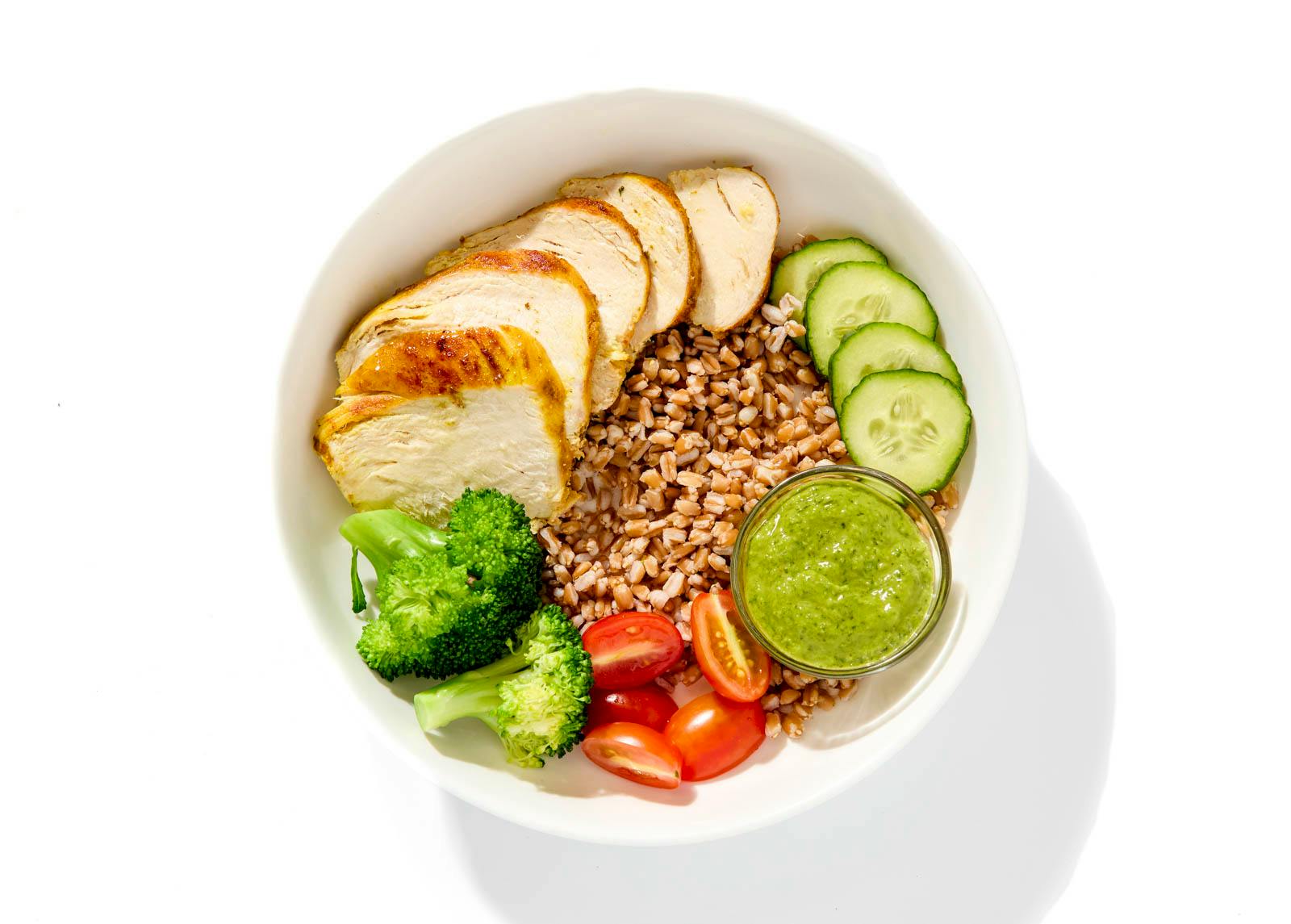 It’s the season of sun-soaked bowls, and Chef Abe’s is built for flavor-chasers. Juicy chicken breast is baked with garlic and turmeric until golden and fragrant, then tucked over a hearty base of nutty, chewy farro. Layered with garlicky broccoli, cooling cucumber, and cherry tomatoes, it’s finished with a vibrant green goddess sambal dressing—creamy, herbaceous, and spiked with heat.