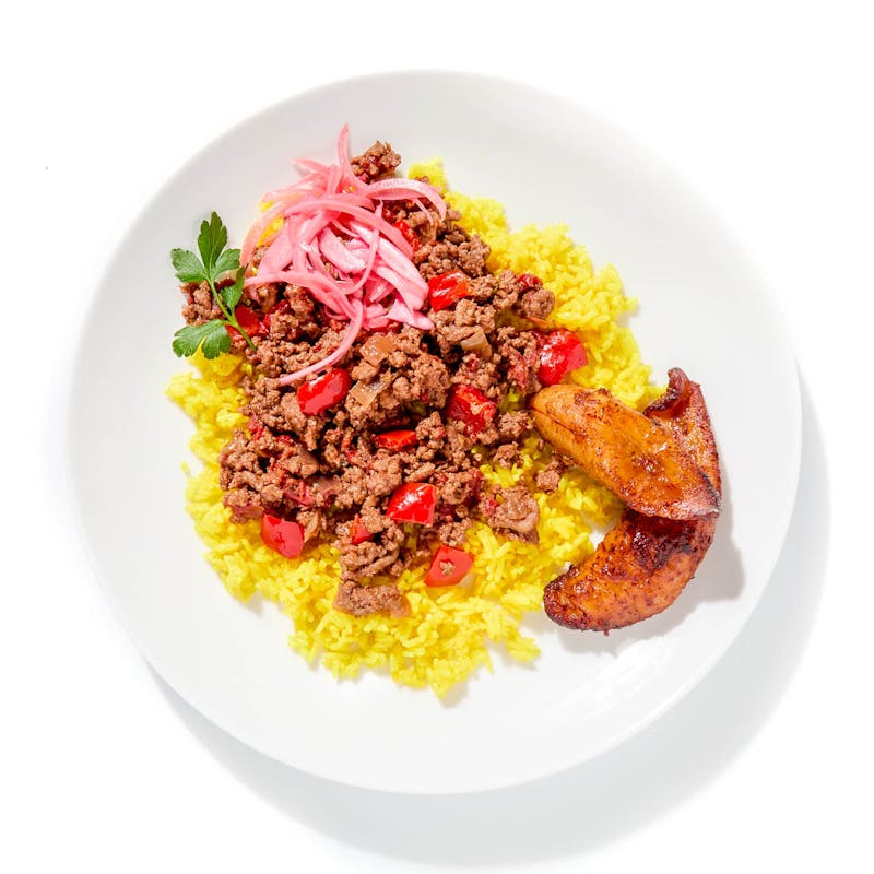 Ground Beef, Plantain, Jasmine Rice, Red Onion, Plum Tomato, White Vinegar, Red Bell Pepper, Coconut Milk, Canola Oil, Garlic, Spice Blend, Sweet Soy Sauce, Spice Blend, Extra Virgin Olive Oil, Sugar, Sunflower Oil, Cumin, Chicken Base, Vegetable Base, Kosher Salt, Lemongrass, Turmeric, Italian Parsley, Kaffir Lime