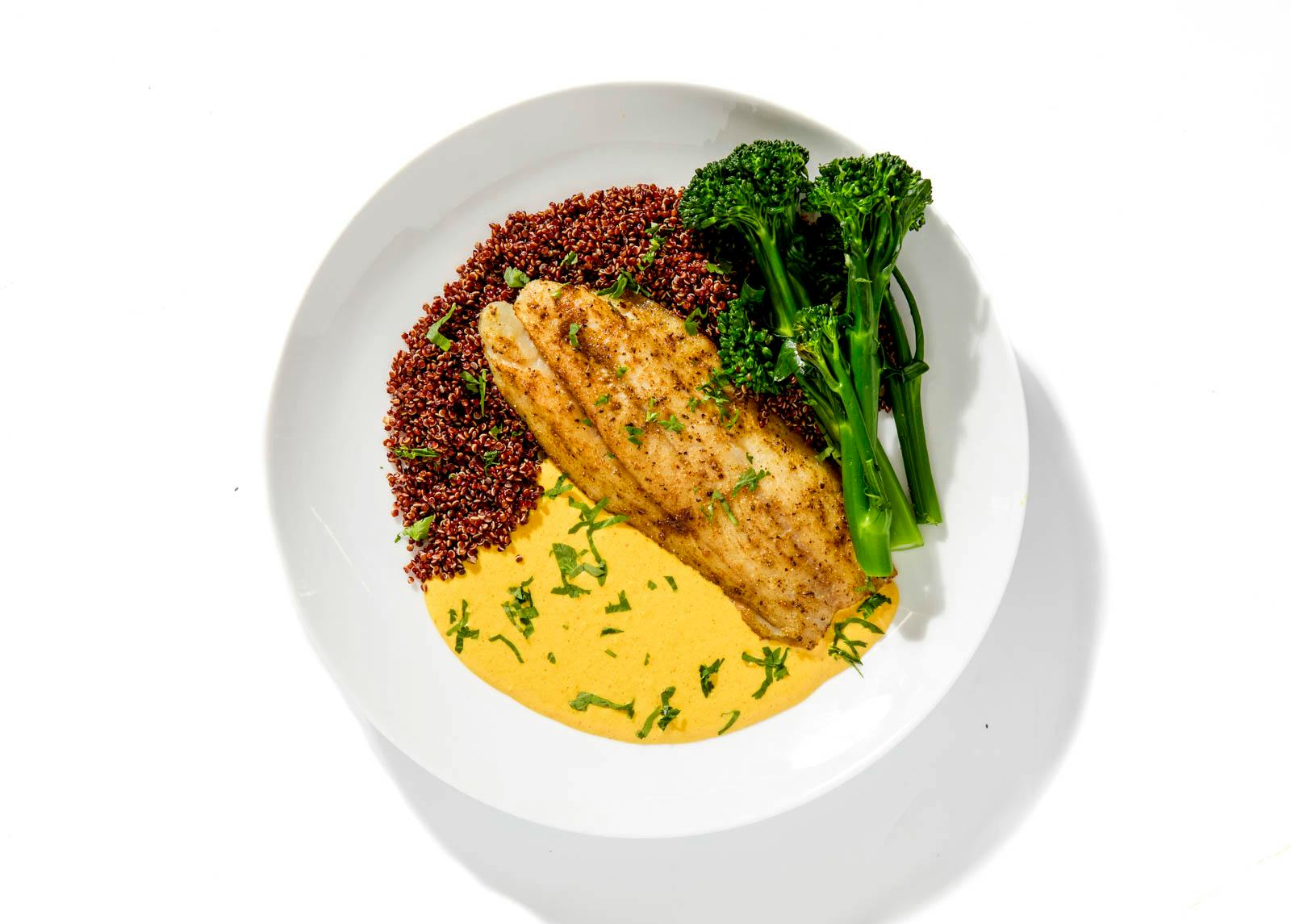 Barramundi, Broccolini, Coconut Milk, Red Quinoa, Macadamia Nuts, Extra Virgin Olive Oil, Lemon Juice, Spice Blend, Garlic Powder, Turmeric, Cumin, Garlic, Chicken Base, Black Pepper, Kosher Salt, Cilantro