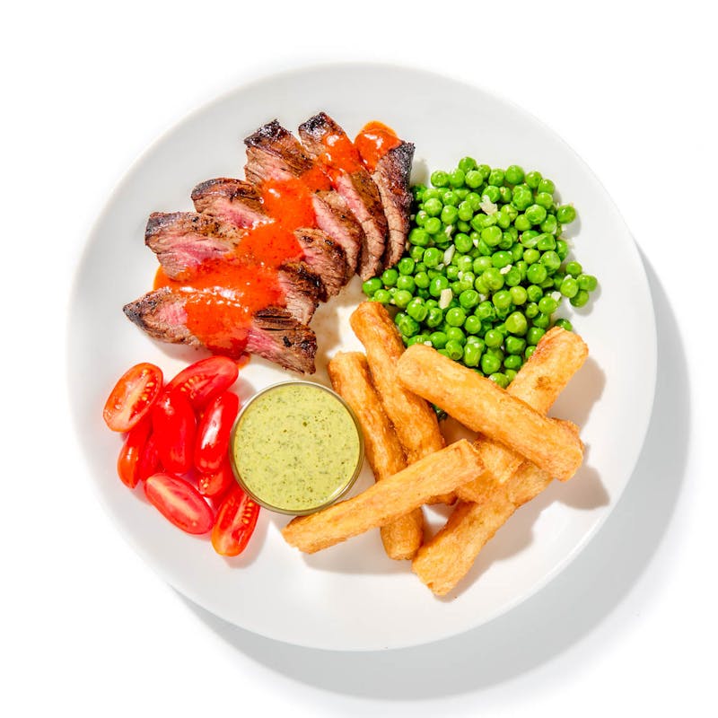 Spice Blend, Sweet Soy Sauce, Yucca Fries, Spice Blend, Chives, Flank Steak, Cherry Tomato, Butter, Extra Virgin Olive Oil, Coriander, Onion Powder, Garlic Powder, Garlic, Honey, Corn Starch, White Pepper, Peas, Kosher Salt, Mayonnaise, Chicken Base, Light Brown Sugar, Apple Cider Vinegar, Lime Juice, Lemon Juice, Greek Yogurt, Orange Juice, Basil, Canola Oil, Italian Parsley, Paprika